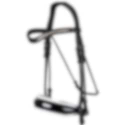 This rolled leather double bridle from Dyón comes with many advanced features such as the ergonomic design, extra wide noseband that tapers off and curves at the sides to reduce the risk of shafing between the bit and noseband and the crank noseband fastening. The anatomic design headpiece provides added space around the ears whilst the cheek pieces are attached to the noseband sides for extra comfort. In addition, the headpiece feature neoprene padding and a soft sheep leather lining (without the fleece). The diamanté browband comes as standard with this bridle. Available in Black or Brown, with or without a shiny patent finish and with a matching coloured or white padded noseband. Reins not included.