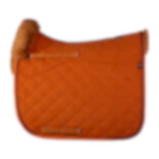 This is a premium-quality sheepskin saddle pad with an integrated sheepskin pad inside. Its channels run along each side of the horse’s spine and around the front arch of the saddle. The sheepskin helps to distribute pressure and wick away moisture from the horse. The top of the saddle pad is made of striking corduroy fabric.