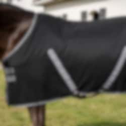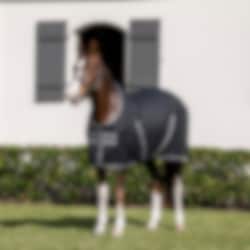 The rug offers a classic cut with a straight front closure, adjustable cross surcingles and a tail strap for a secure and stable fit – ideal for use in the stable, during transport or after training.