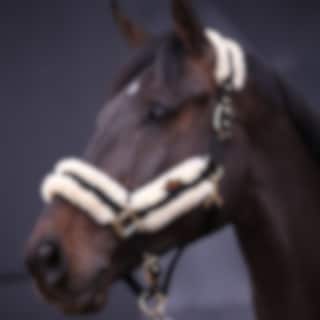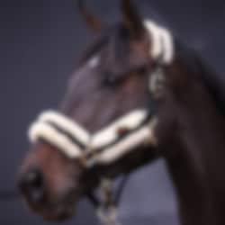 This black nylon headcollar is lined with soft, natural-coloured synthetic sheepskin, a stylish detail that also helps to minimise the risk of rubbing. The headcollar is adjustable on one side and under the chin. Features a gold-toned Kentucky logo badge on the side and gold-coloured buckles.