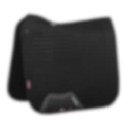 The 100% natural bamboo material controls heat and sweat and transports moisture away from the horse very effectively. The saddle pad has an edge band that is made of a soft frictionless suede-like material that is specially made to smoothly follow the edges. This new technology helps maintain the perfect fit under the saddle. Where the saddle pad wears the most (at the saddle girth), there is a PU leather material that protects the dressage pad from wear and tear.