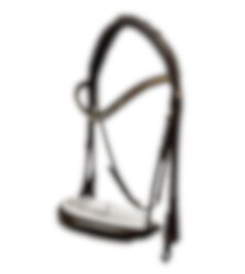 Otto Schumacher's double bridle in the model München Feel Good is an elegant double bridle in brown leather with white padding. The designation "Feel Good" means that the headstall on the double bridle is anatomically adapted with extra padded leather to reduce pressure on the horse's sensitive nerve pathways. The noseband on the double bridle is in the model Cut back 4.5 cm which means that the noseband is back-cut and thus narrows at the sides where the horse has the least space at the bit, the noseband is closed at the back and has white padding.
