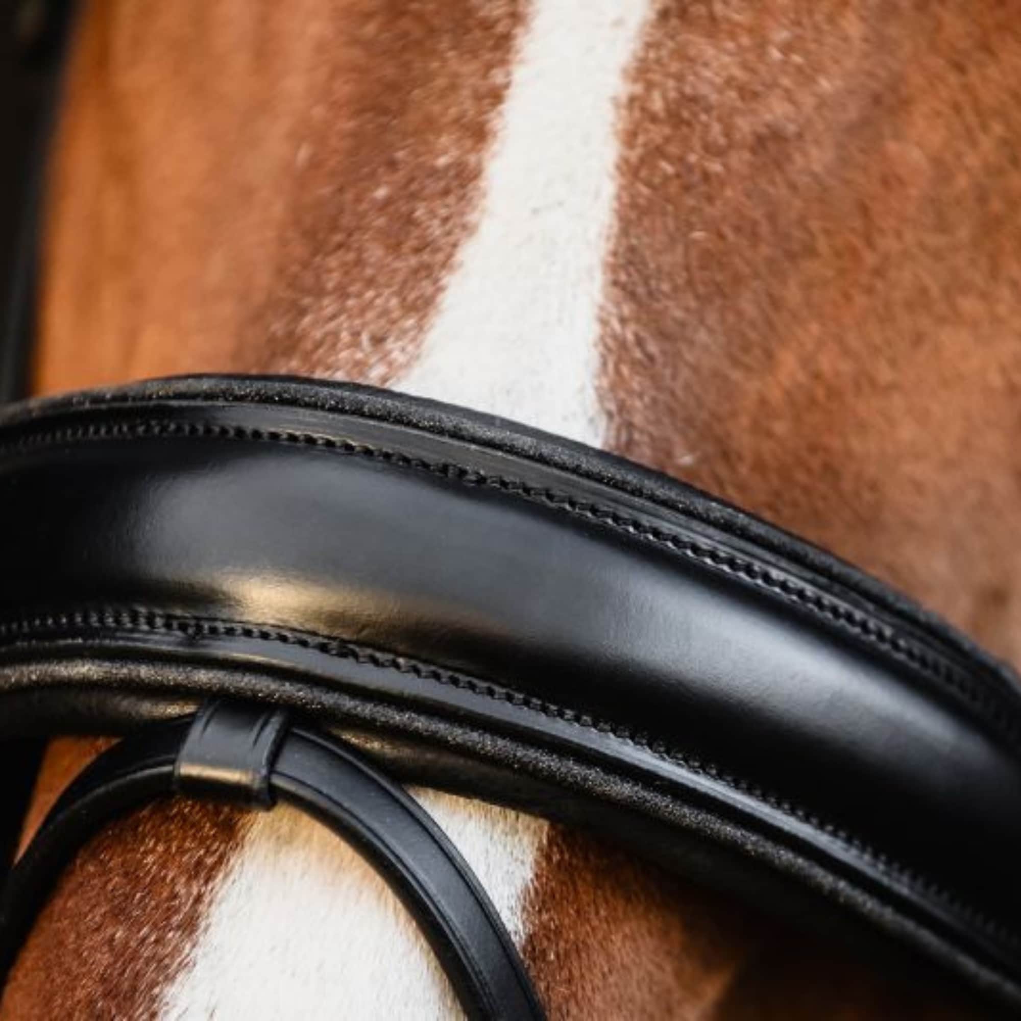 The anatomically shaped headpiece is inspired by Schockemöhle’s Equitus line and is designed to distribute pressure evenly over the poll. This design helps create a comfortable fit while reducing pressure on sensitive areas.