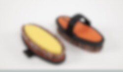 The brush have a sponge in the middle and bristles along the edge. The wash brush has a strap over your hand, which makes it easier to hold while you washing the horse.