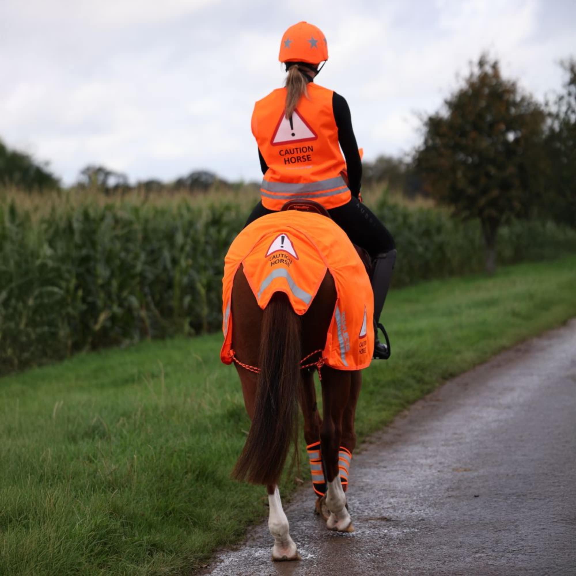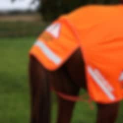 The exercise sheet is available in orange with reflective strips on each side of the horse’s rear.