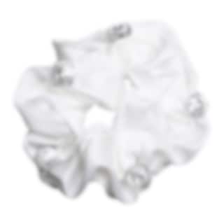 An elastic scrunchie in a satin-similar material with several slightly larger pearl details, from SD Design. White