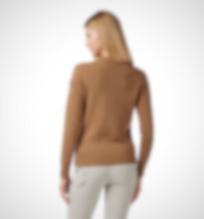 Vestrum's knitted sweater in the color Corten Beige is designed with details of a saddle, boot, horseshoe, and stirrup in a lighter beige shade. The sweater is made from a soft, warming material suitable for cooler weather. On one arm, there is Vestrum's classic logo in leather.