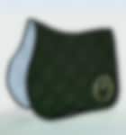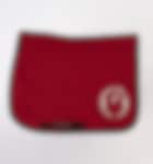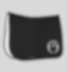 This saddle pad is white with black piping and logo. Perfect for when you and your horse are heading to a competition!