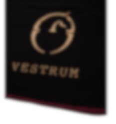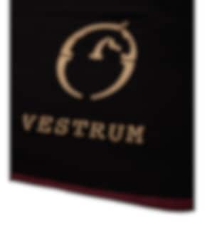 The fleece rug is black with refined details in burgundy and gold, including the Vestrum logo and text on the left side, giving it an exclusive and sophisticated appearance.