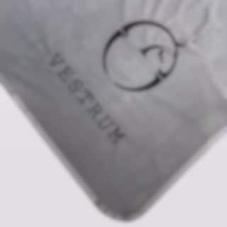 The fleece rug is grey with refined black details, including the Vestrum logo and text on the left side, giving it an exclusive and sophisticated appearance.