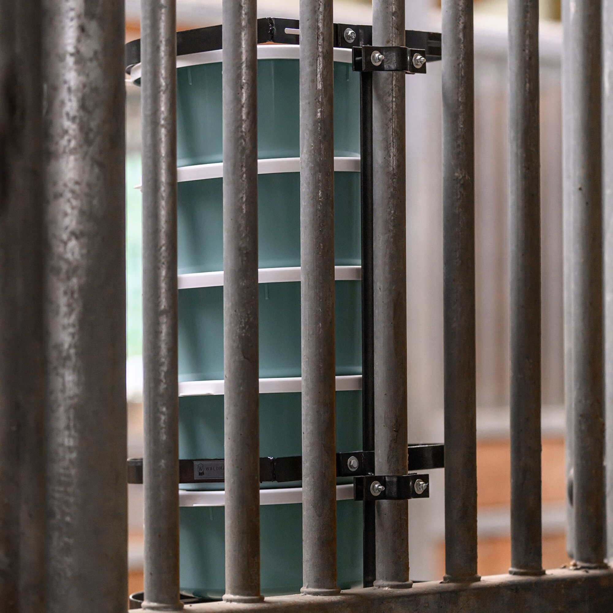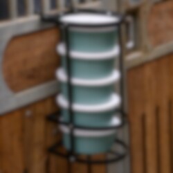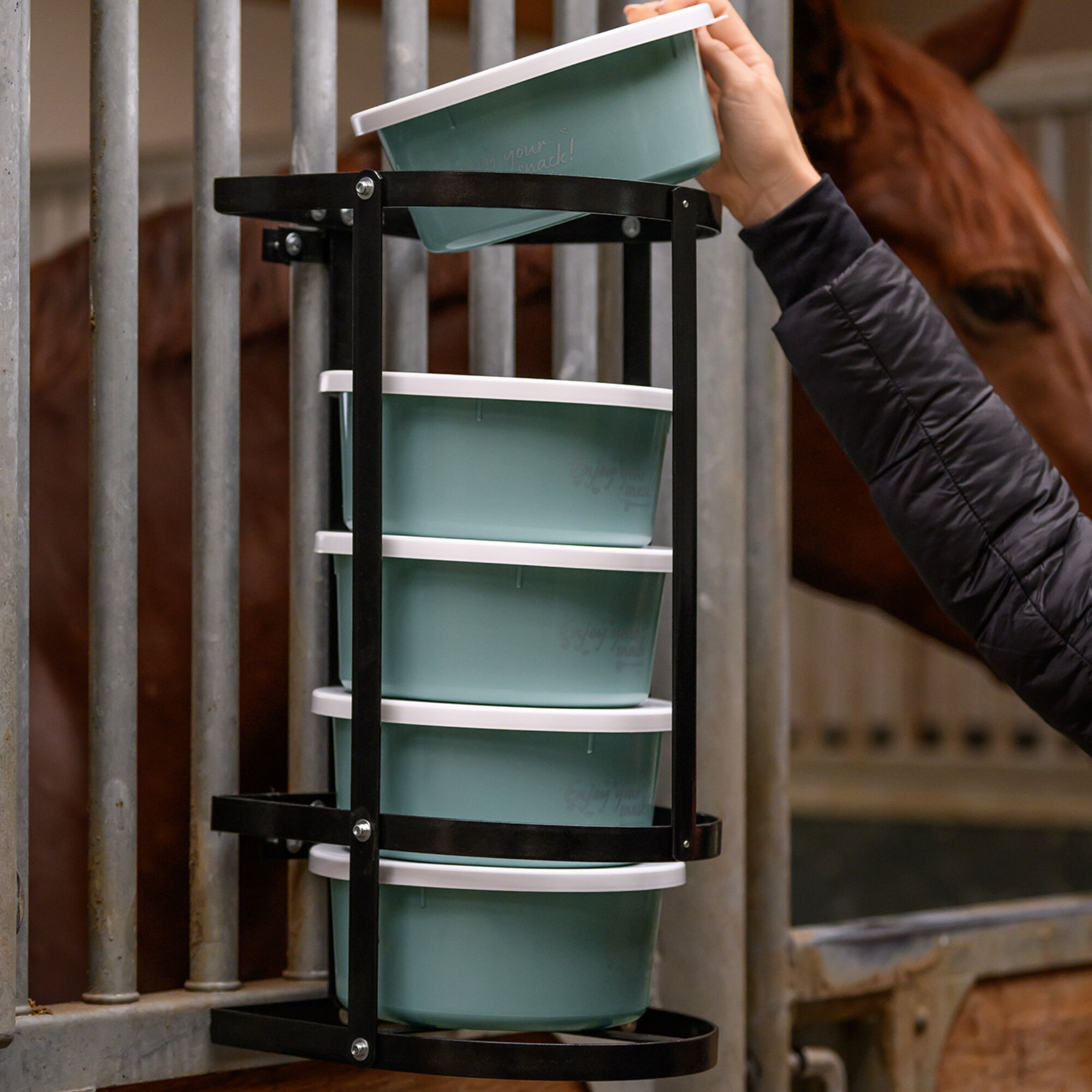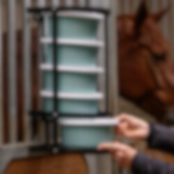 Thanks to the automatic dispensing mechanism, the bottom feed bowl is easily removed and, after use, simply placed back on the top. A smart and efficient way to organise the feeding routine in the stable.