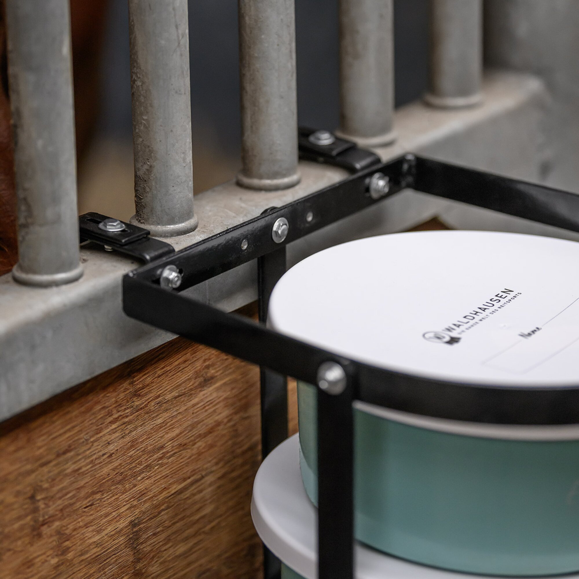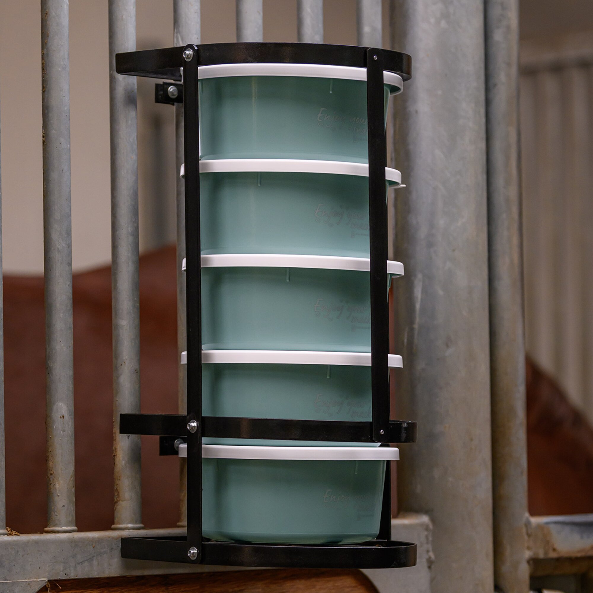This practical feed bowl holder accommodates up to 5 x 2-liter feed buckets.