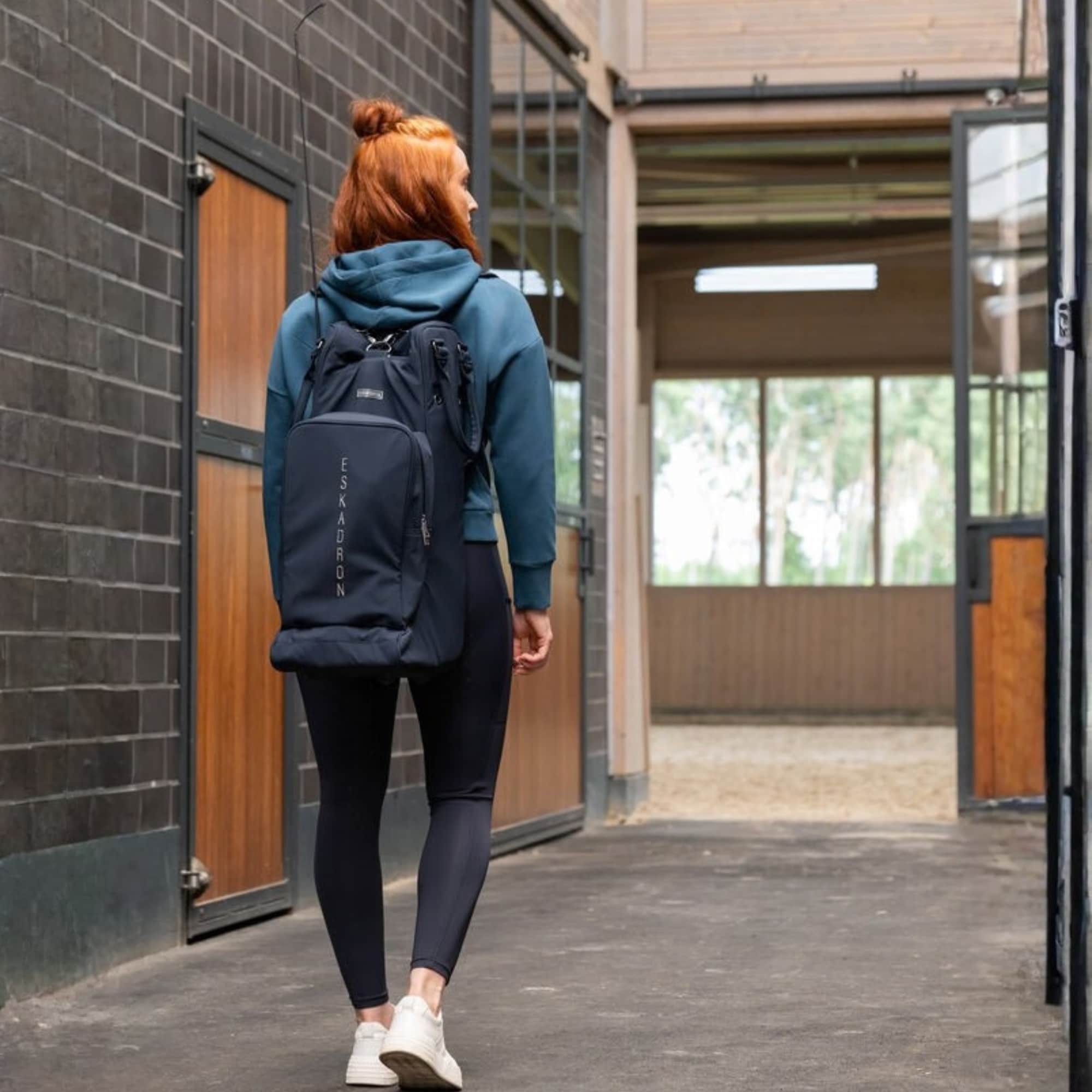 The bag has two separate zip compartments. One compartment is designed for riding boots and includes a practical divider to keep the boots apart. The other compartment is intended for a riding helmet and also includes a separate pocket for smaller accessories. On the outside there is a dedicated compartment for whips.