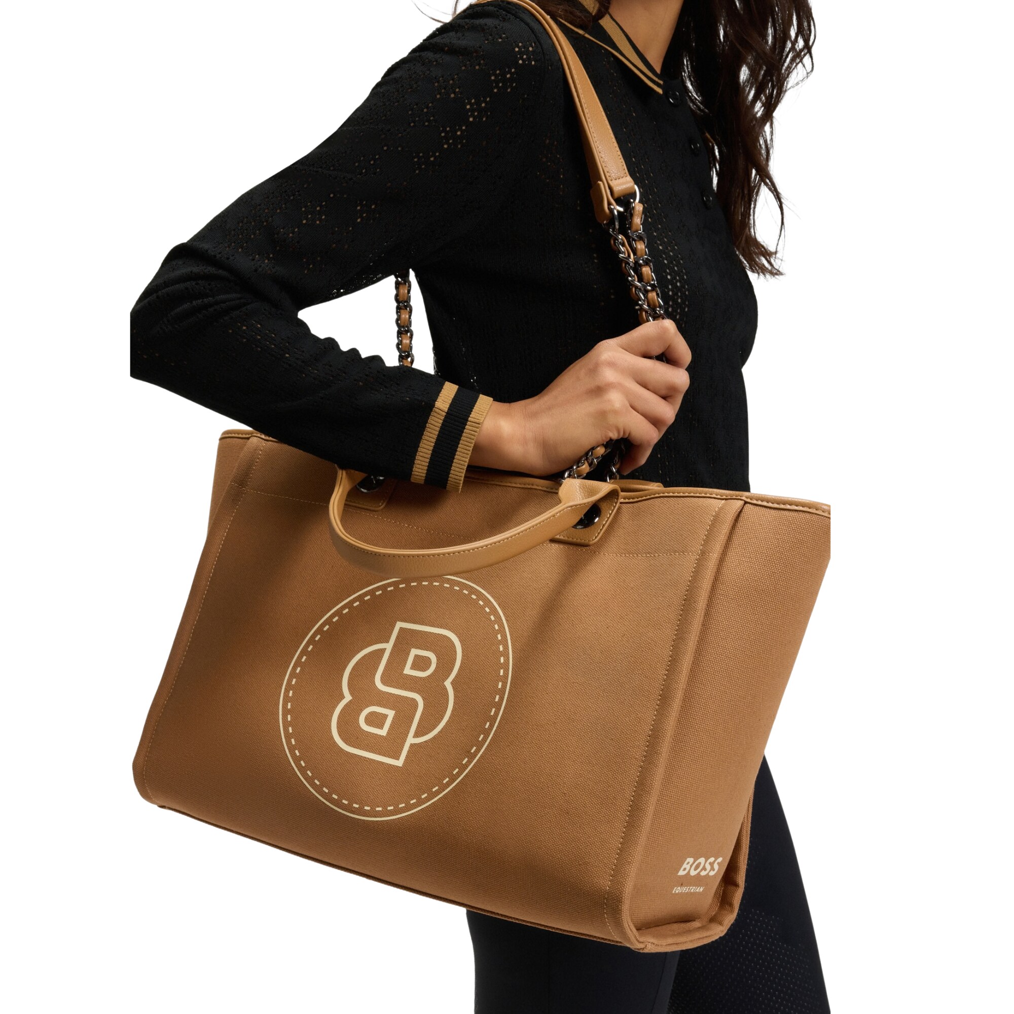 Charleen is an exclusive bag from BOSS Equestrian in coated canvas, decorated with the iconic BOSS Equestrian Double B logo in a circle on the front, as well as a discreet BOSS Equestrian logo on the side. This bag is made from durable canvas with a PU coating, providing a hard-wearing surface that resists everyday wear and comes with stylish shoulder straps with an interwoven chain detail.