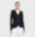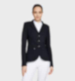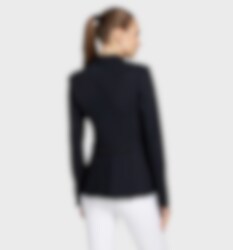 This competition jacket from Samshield is incredibly elegant and also very comfortable thanks to the stretchy fabric. The riding jacket has fine sparkling details with black Swarovski® stones on the collar and on the back. The swarovski material is called Crystal Fabric and can also be put on your riding helmet from Samshield if you want them to match.
