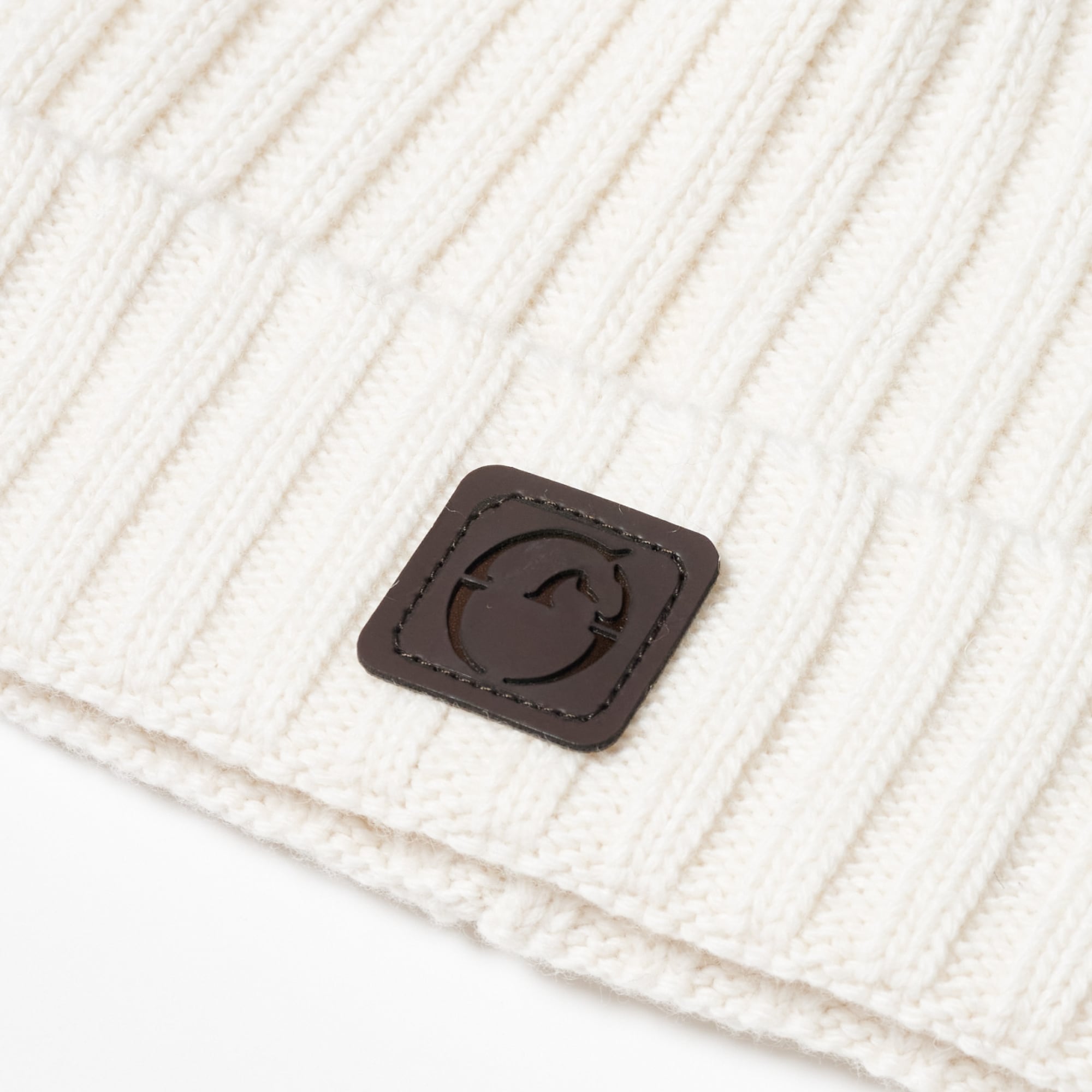 Rib-knit beanie in soft yarn with a folded cuff and leather Vestrum logo on the front. Sleek design in Optical White, suitable for both everyday wear and the stable.