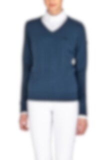 This v-necked sweater in finely knitted material has a modern, nice color called Diplomatic Blue. The riding sweater is thin, soft and stretchy and also has a B-move material on the shoulders. It has the classic logo with three horses on the chest and an Equiline logo on one arm.