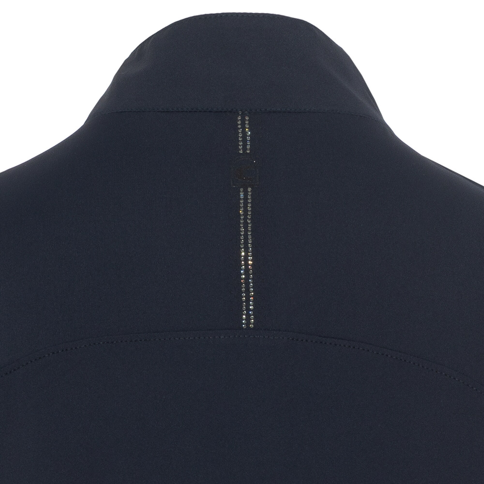 The short front zip is finished with a sparkling crystal pendant, adding a luxurious touch. On the left chest, a glossy black Cavallo print embellished with shimmering crystal stones creates an exclusive look, while the back is decorated with a black stirrup print featuring crystal details.