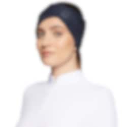 - Navy headband with crossed, ribbed, and elastic pattern