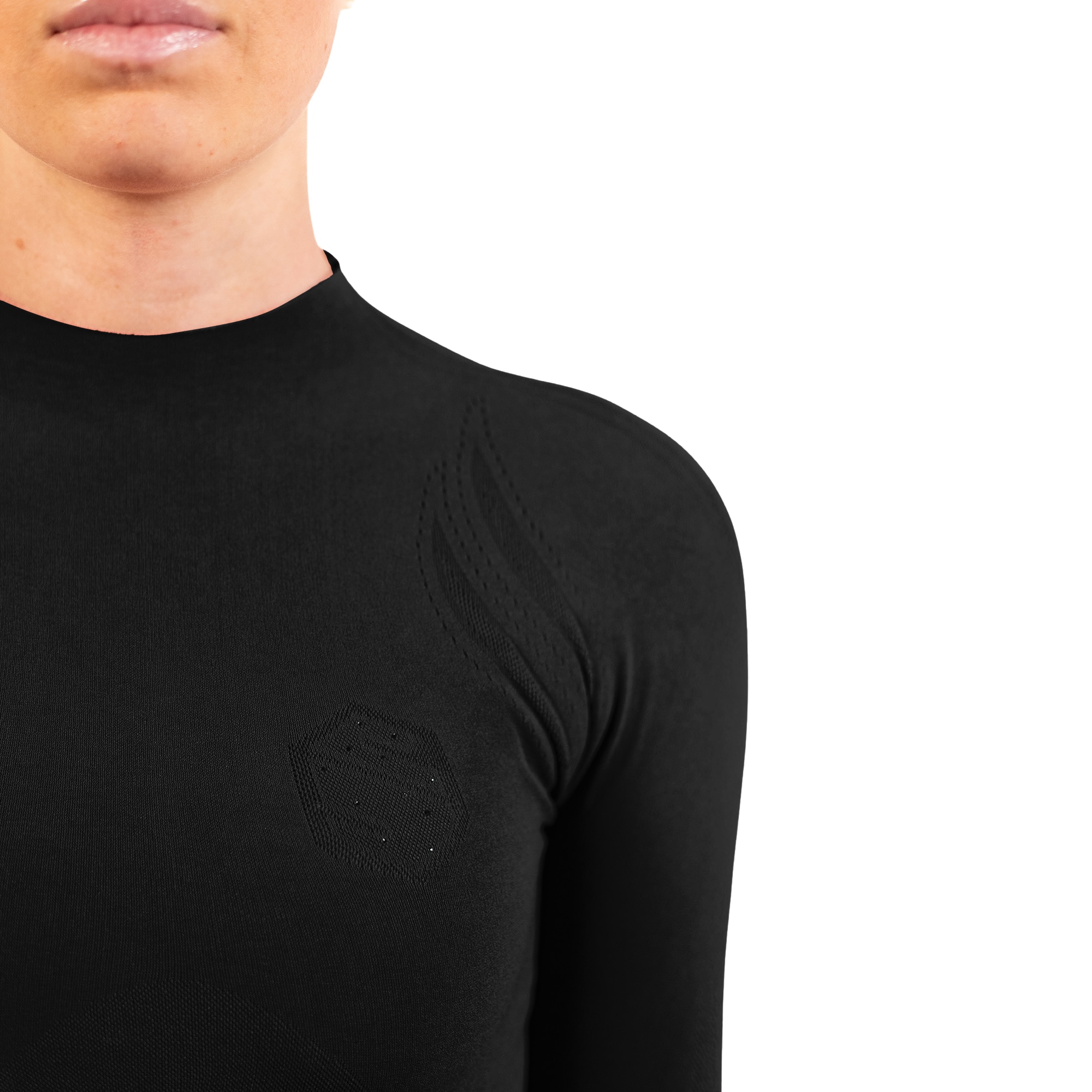 The Alicia Seamless Shirt in black from Samshield is designed for riders who want to combine style and performance in a lightweight, seamless technical top. The shirt features a discreet, slightly high collar, long sleeves, and no zip, creating a minimalist and functional design. The Samshield blazon with crystal details on the back and crystal silver on the zip tab adds a subtle, luxurious touch. Its seamless structure ensures maximum comfort and prevents chafing during sports and riding.