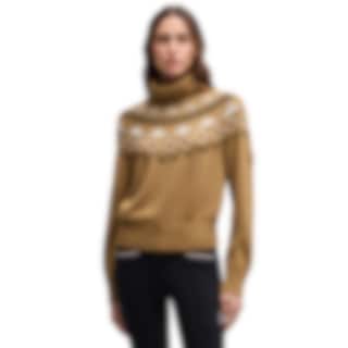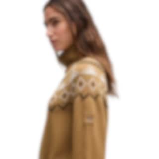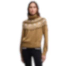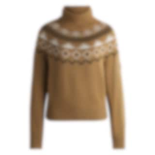 The jumper comes in a classic camel shade and is decorated with a Norwegian-inspired pattern that adds a timeless and stylish touch. With its ribbed turtleneck, cuffs, and hem, the garment ensures a good fit and extra comfort.