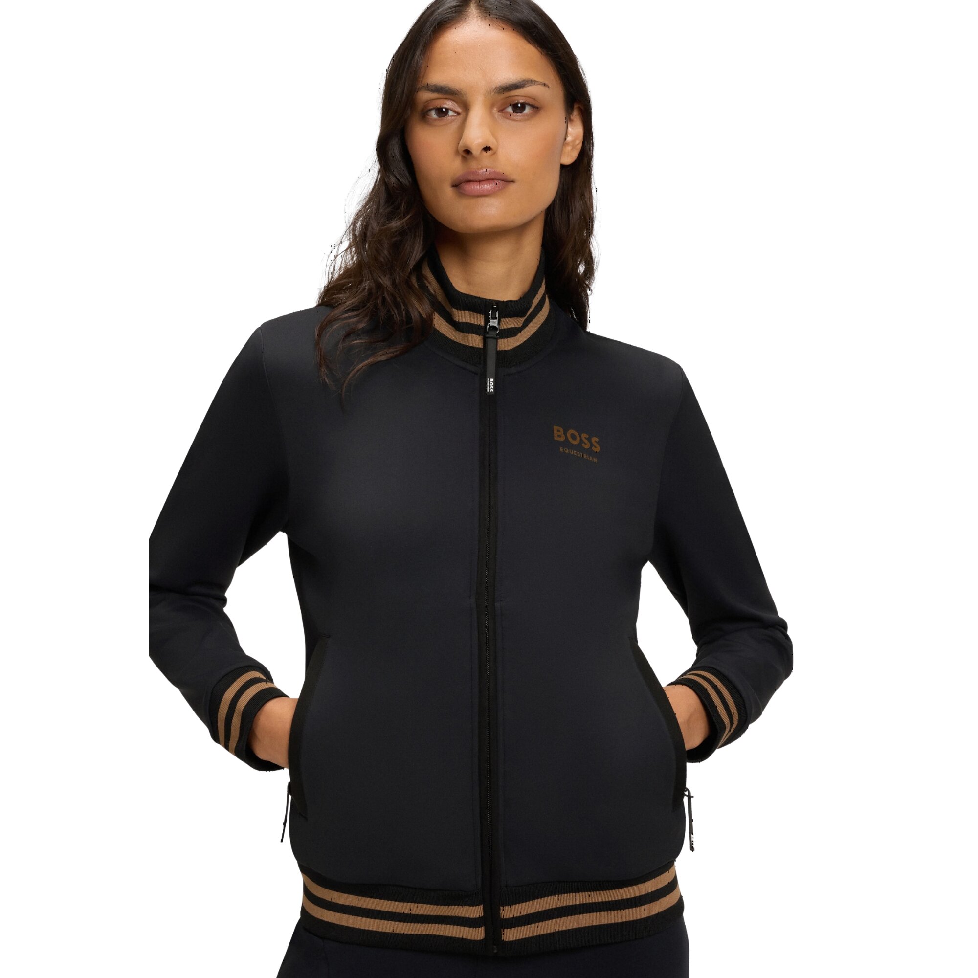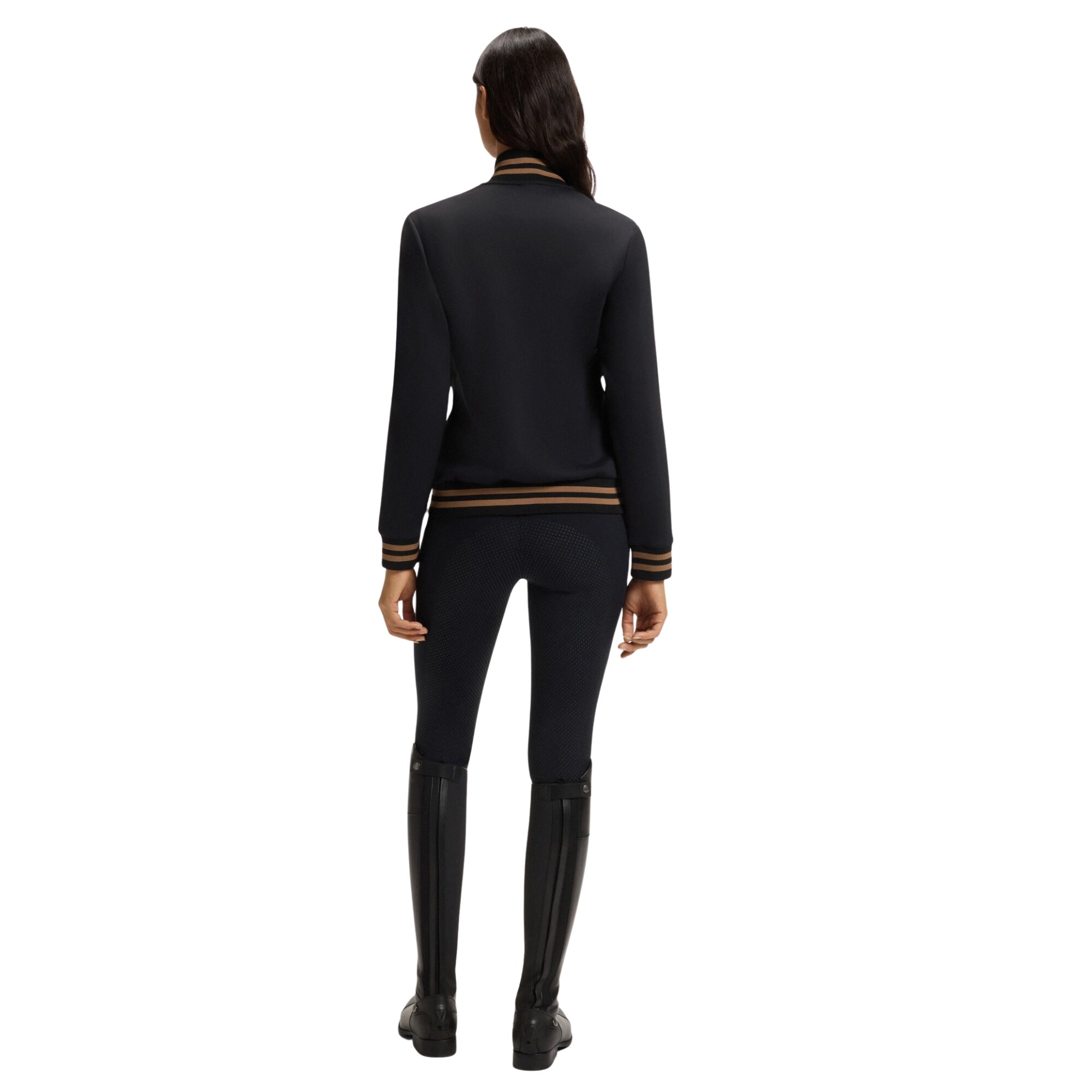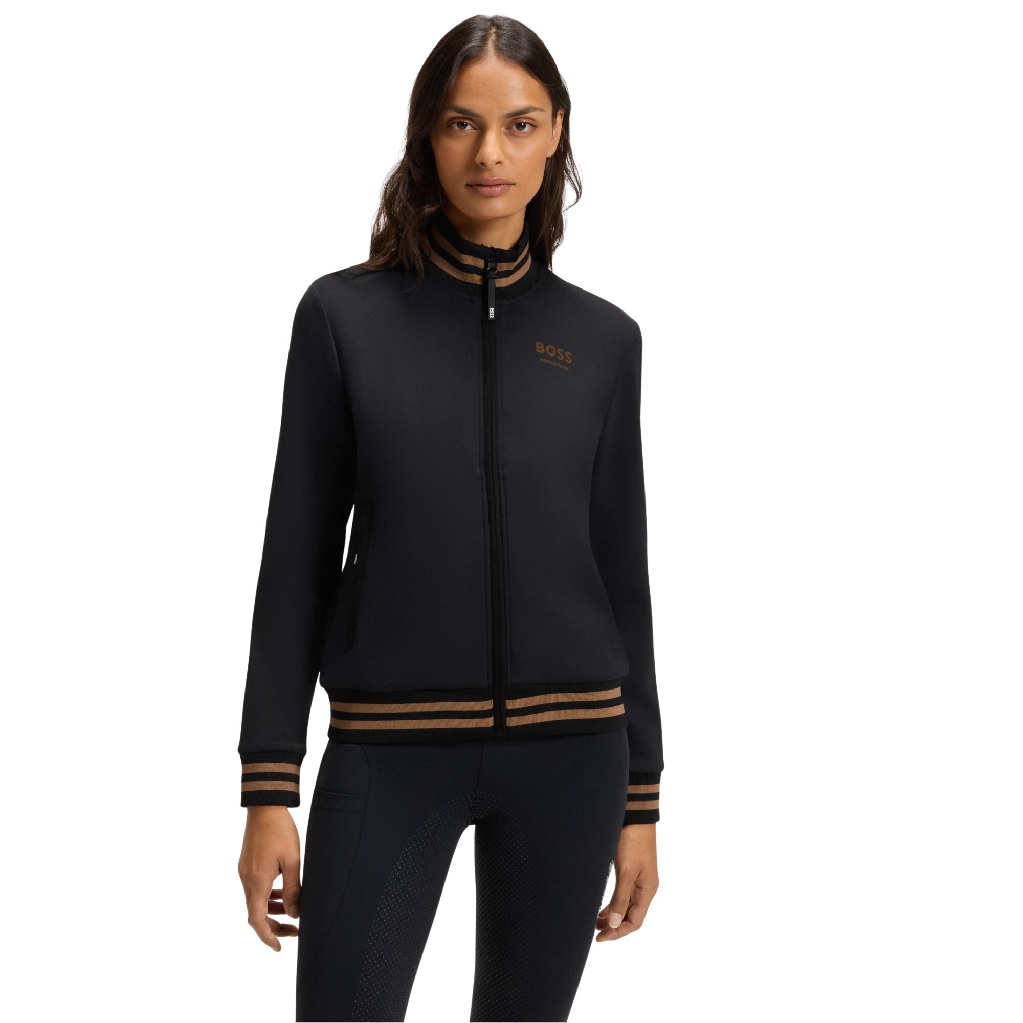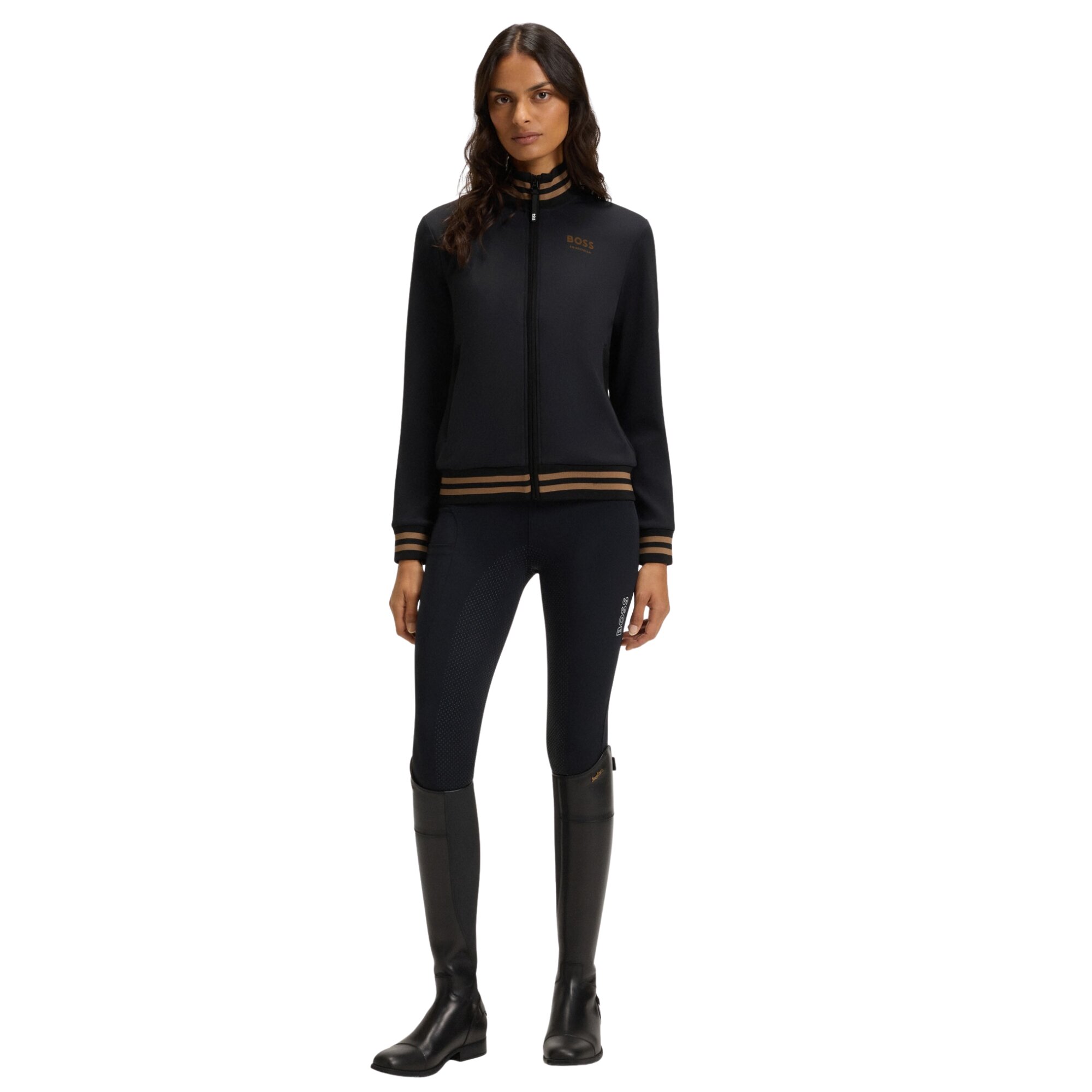 Ava Cardigan is the perfect mid-layer for both the stable and everyday life designed as a functional second-layer, it offers a flexible and comfortable fit. The sleek black design is complemented by contrasting stripes on the ribbed cuffs, adding a sporty and exclusive touch. The BOSS Equestrian logo is featured on the chest.