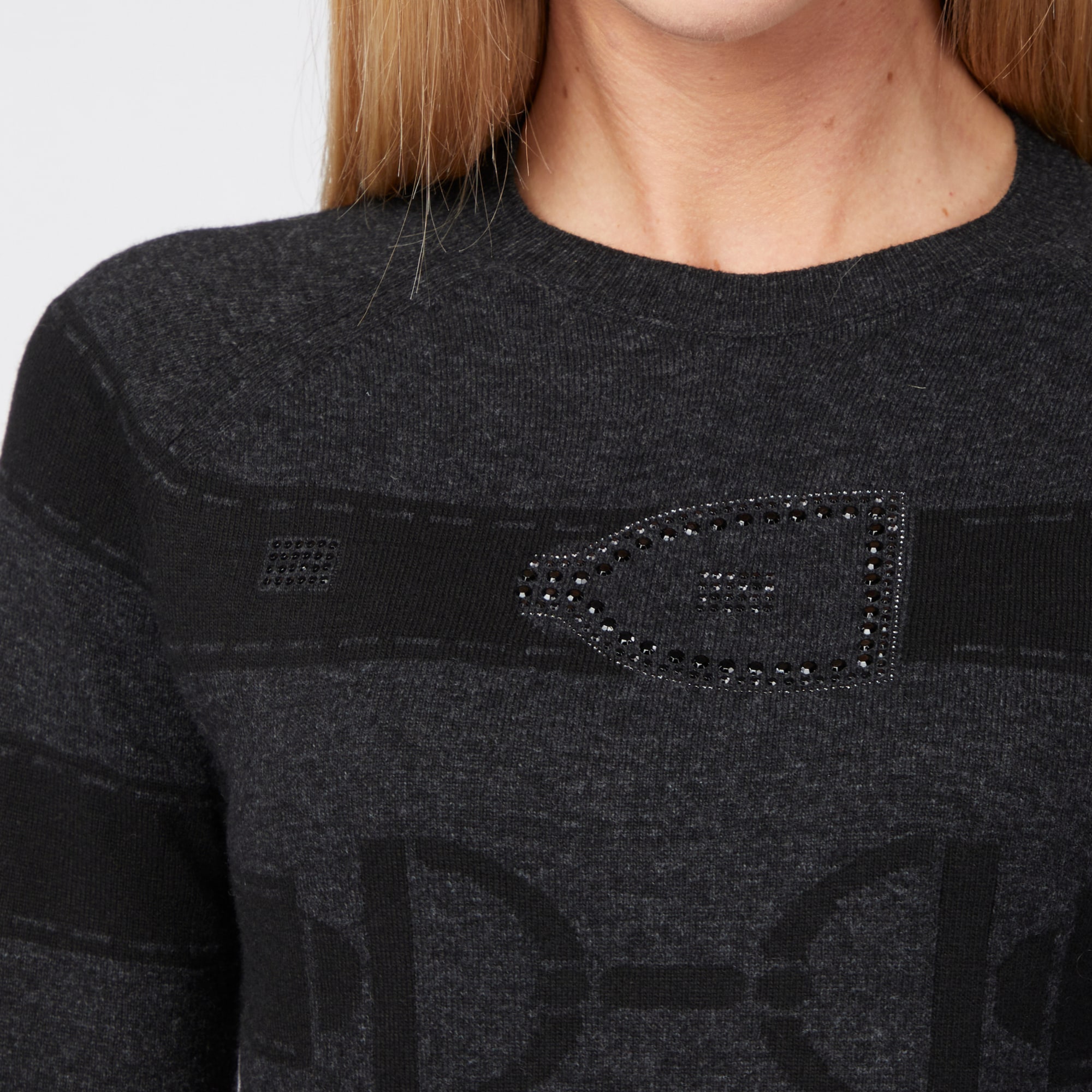 The Vestrum Hanoi Knitwear in Charcoal Black is an exclusive knitted turtleneck sweater featuring a decorative bit and horse motif in black, adorned with sleek studs on the upper part of the sweater.