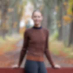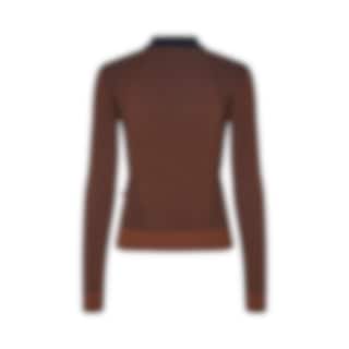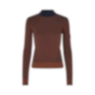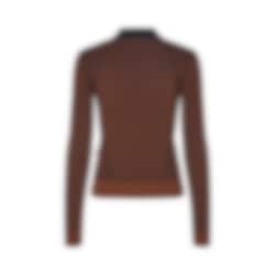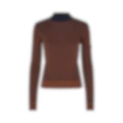 The design combines a warm brown tone with a dark, contrasting collar and subtle knit patterns that create a discreet texture. The long sleeves and high neckline make it suitable for cooler weather, while the material blend provides a good balance between warmth and breathability.