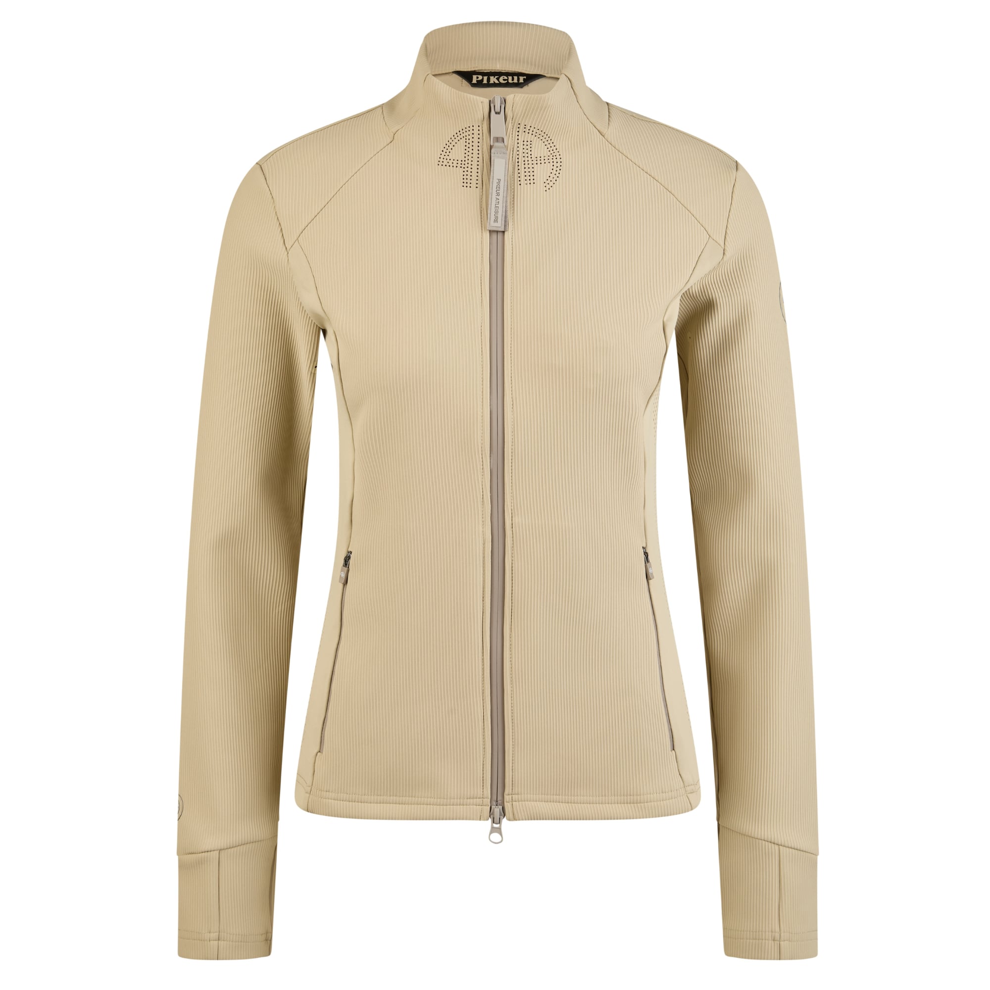 The top is closed with a two-way front zipper and features a decorative zipper pull. Side pockets with zippers provide practical storage. At the front of the collar, Pikeur Athleisure perforation adds a technical detail. The design is clean, with a glossy silicone-printed logo on the sleeves, side panels, and on a label at the back of the neck.