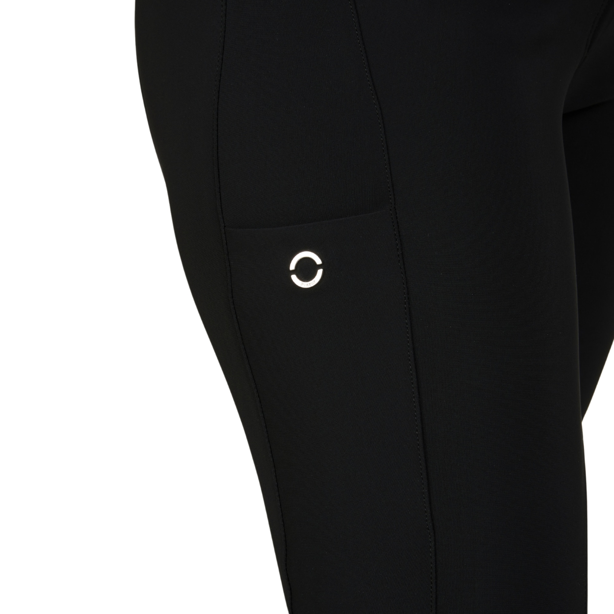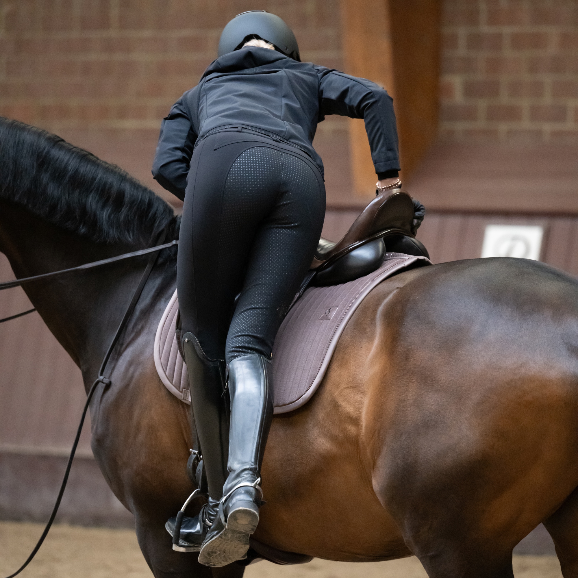 The full grip provides a stable seat with a secure yet saddle-friendly hold, while an integrated phone pocket along the leg adds practical functionality. At the same time, the design remains elegant and timeless.