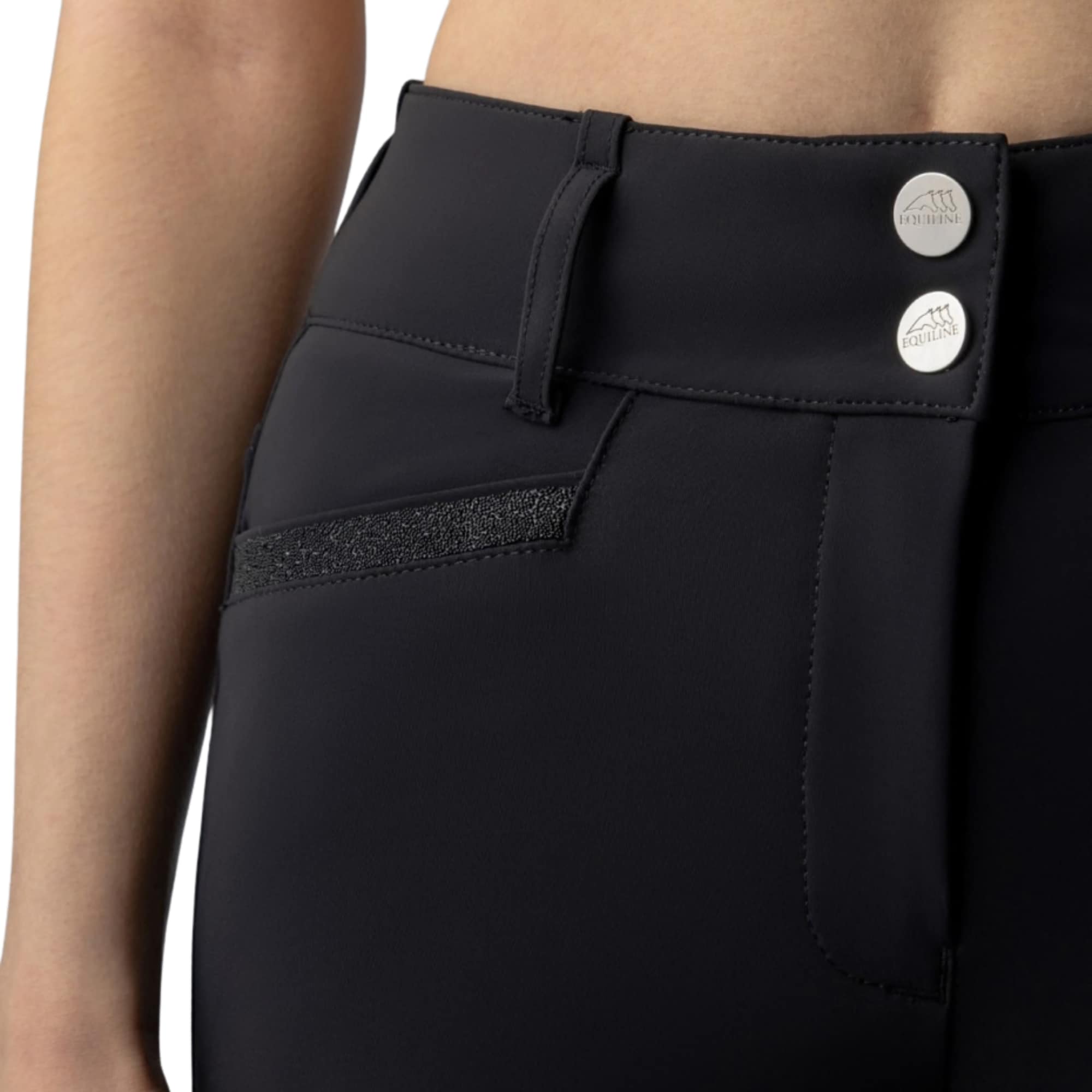 Equiline Crystalef Breeches with a high waist, full grip seat, and crystal fabric details.