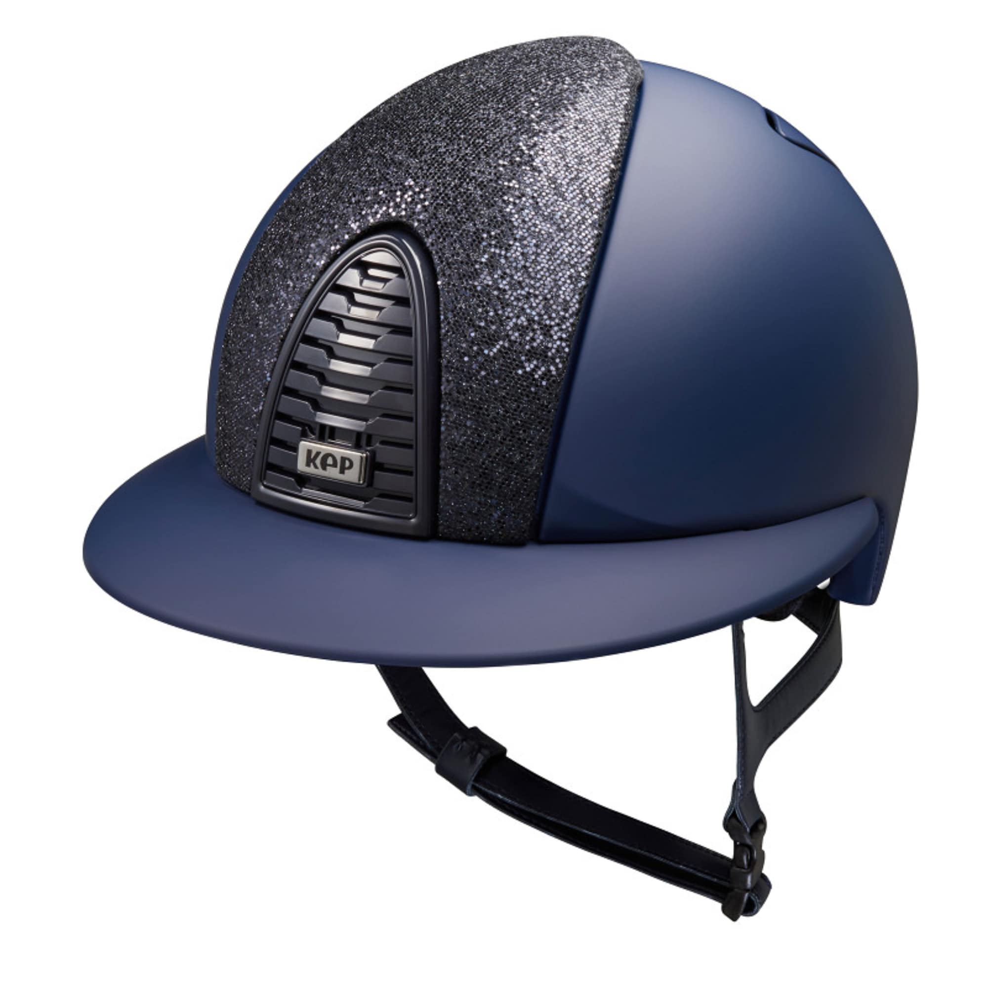 The Cromo 2.0 Matt Polo Inserto Glitter riding helmet has a navy matte shell, rear, visor, and grid. It features a black glitter inserto on the front, a black frame and sub-grid, a chrome button, and a black leather chin strap.