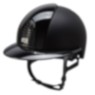 The Cromo 2.0 Textile/Polish riding helmet has a matte shell, a black glossy polo visor, a black polished frame, a polished rear, and a black matte raw grid.