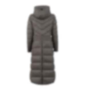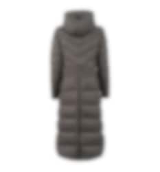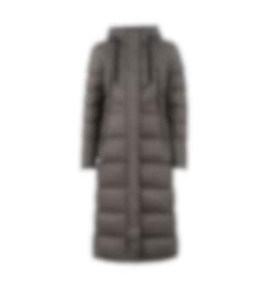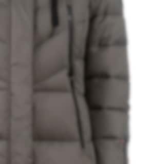The coat is equipped with a large, spacious hood with a high-quality Cavallo label along the edge and a wide black drawstring, allowing you to adjust the hood's fit. The upper part of the coat has a diagonal quilted pattern that transitions into horizontal stitching from the waist down, providing a flattering fit. The two-way front zipper is concealed by a front flap for a stylish look.