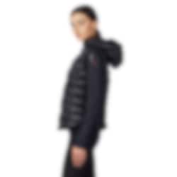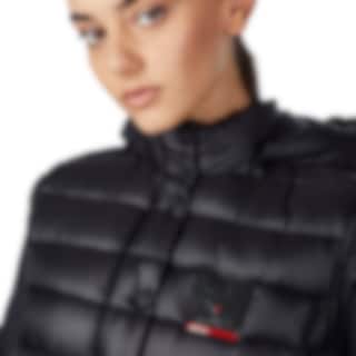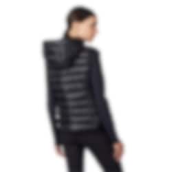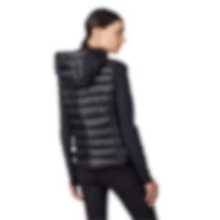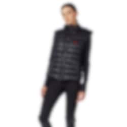 The vest is lined with lightweight, insulating ecodown padding, offering cosy warmth while remaining comfortable and easy to wear. It features a central front zip, complemented by overlapping snap buttons for added protection against the cold. The adjustable hood adds extra functionality.