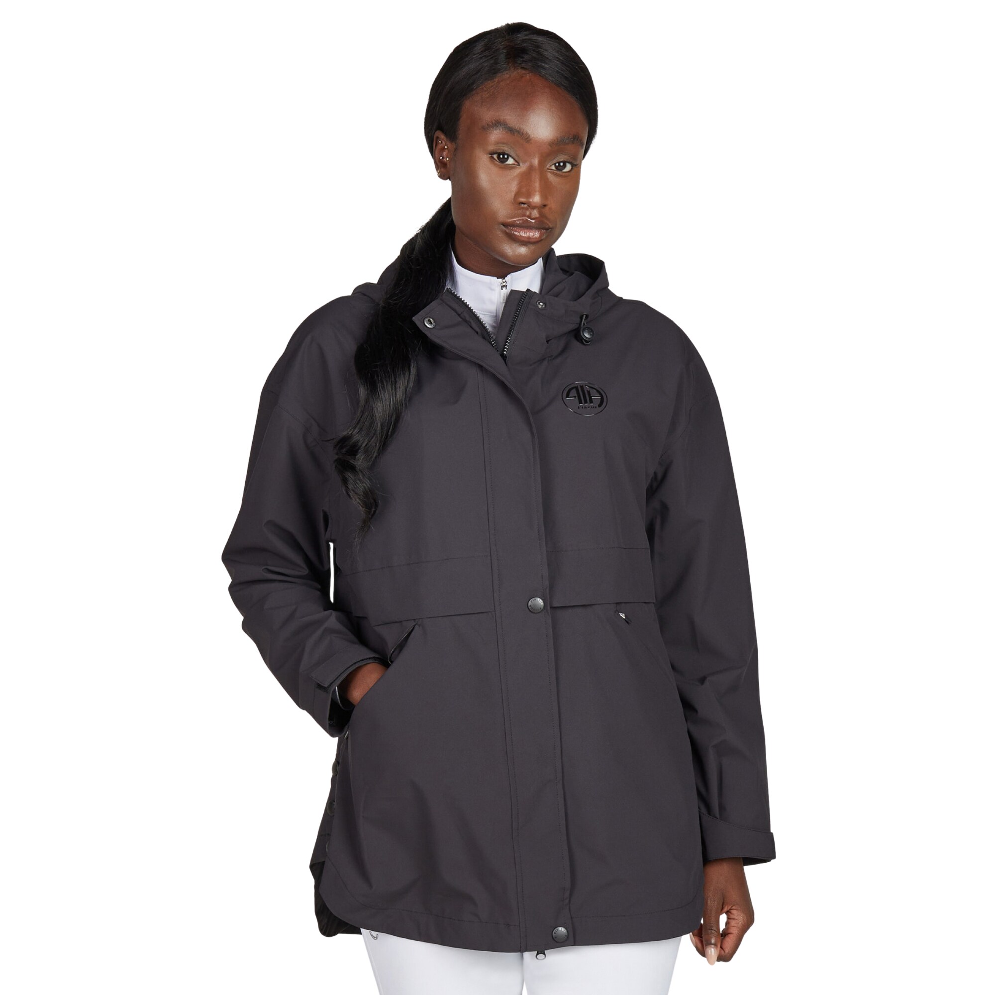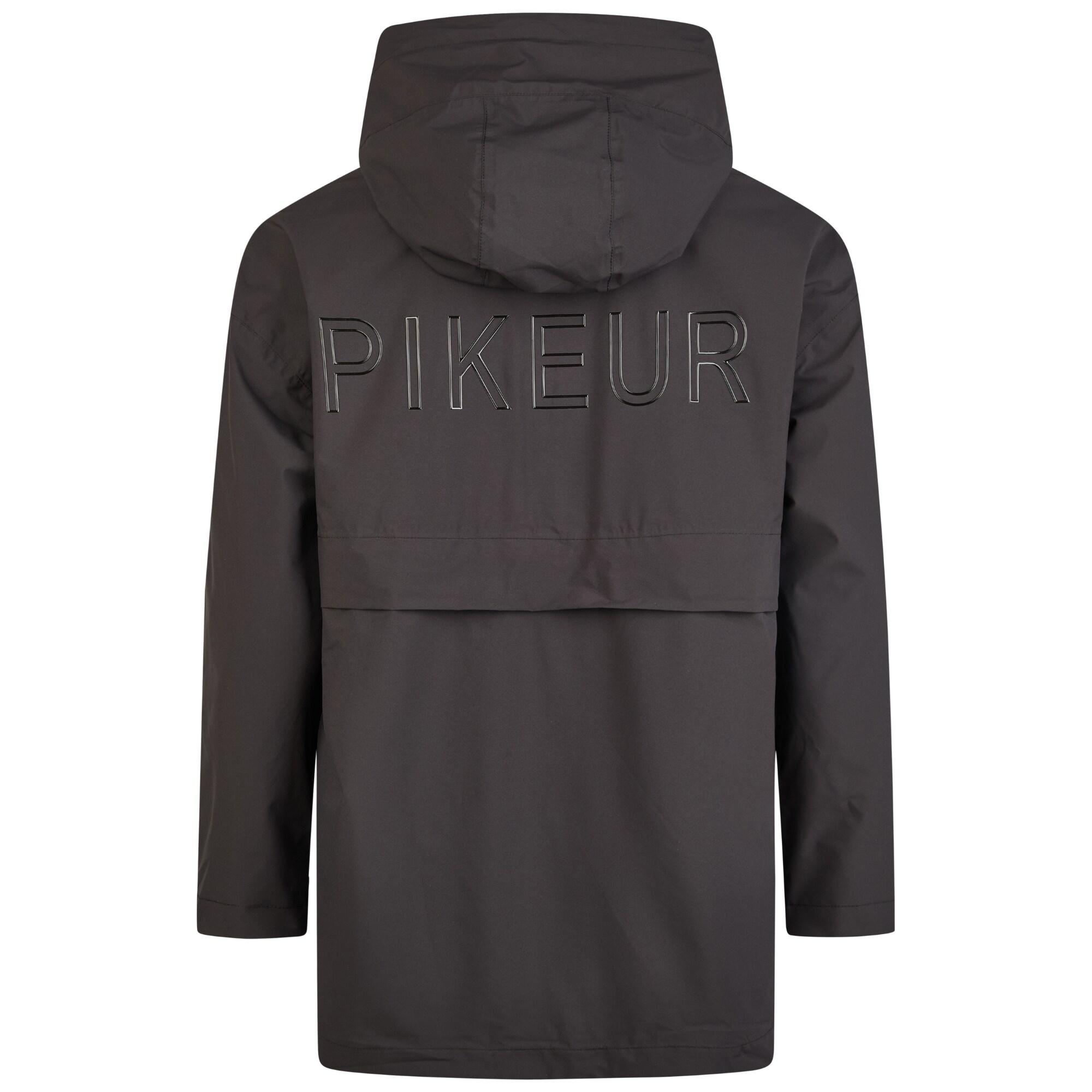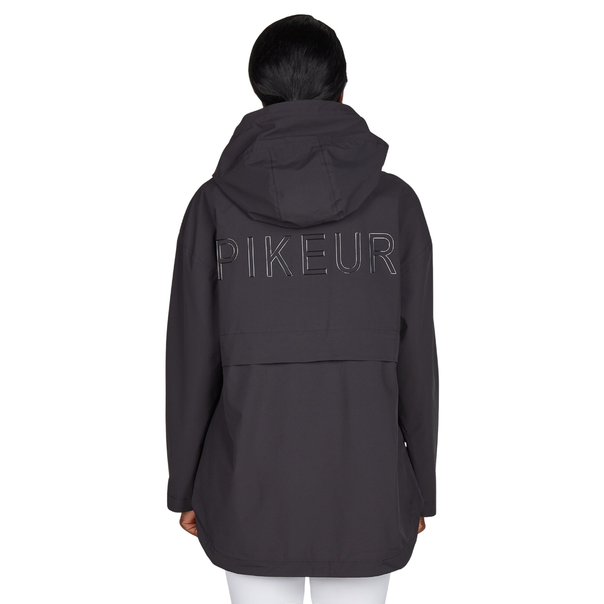 The hood is adjustable with a drawstring and stopper and is equipped with a MAGNET CLICK attachment that keeps the hood in place against the back when not in use. The design is clean, featuring a glossy Pikeur print on the back and a silicone print on the chest.