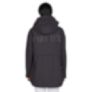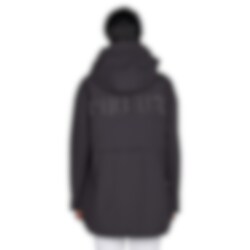 The poncho is closed with a two-way zipper, concealed behind a protective placket and secured with two snap buttons. It features angled, concealed zippered pockets at the front and short side slits with three snap buttons. The sleeve cuffs are adjustable with hook-and-loop fastening.