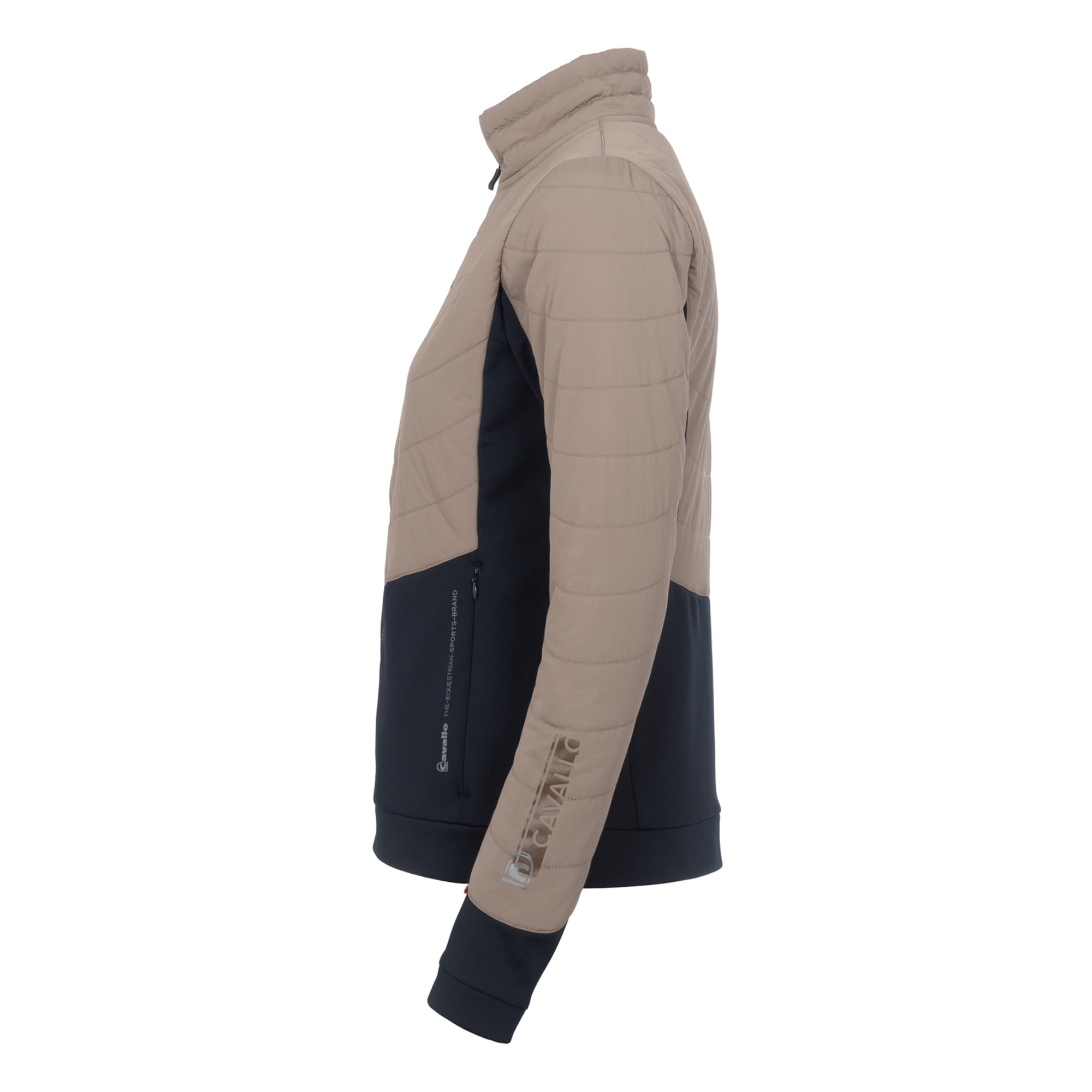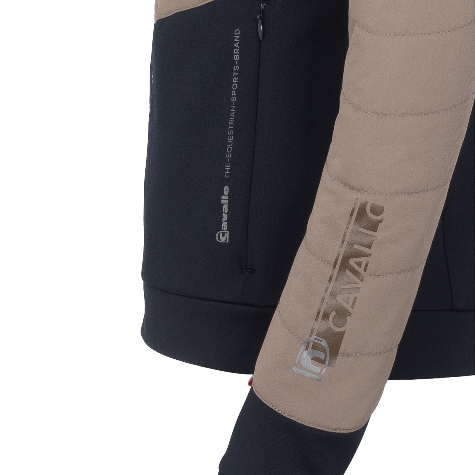 The jacket features a practical 2-way front zip and two side pockets with zips. A contrasting Cavallo logo print is placed on the left chest, left forearm and on the left front pocket.