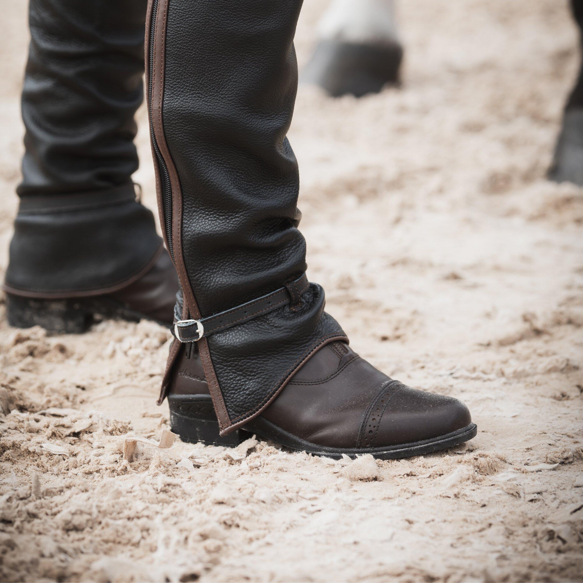 The chaps feature elegant brown leather piping on the outside and a tight model with adjustable belts at the front and back for optimal fit. The durable YKK zipper and adjustable width at the ankles make them both durable and comfortable. Keep in mind that the leather stretches slightly with use.