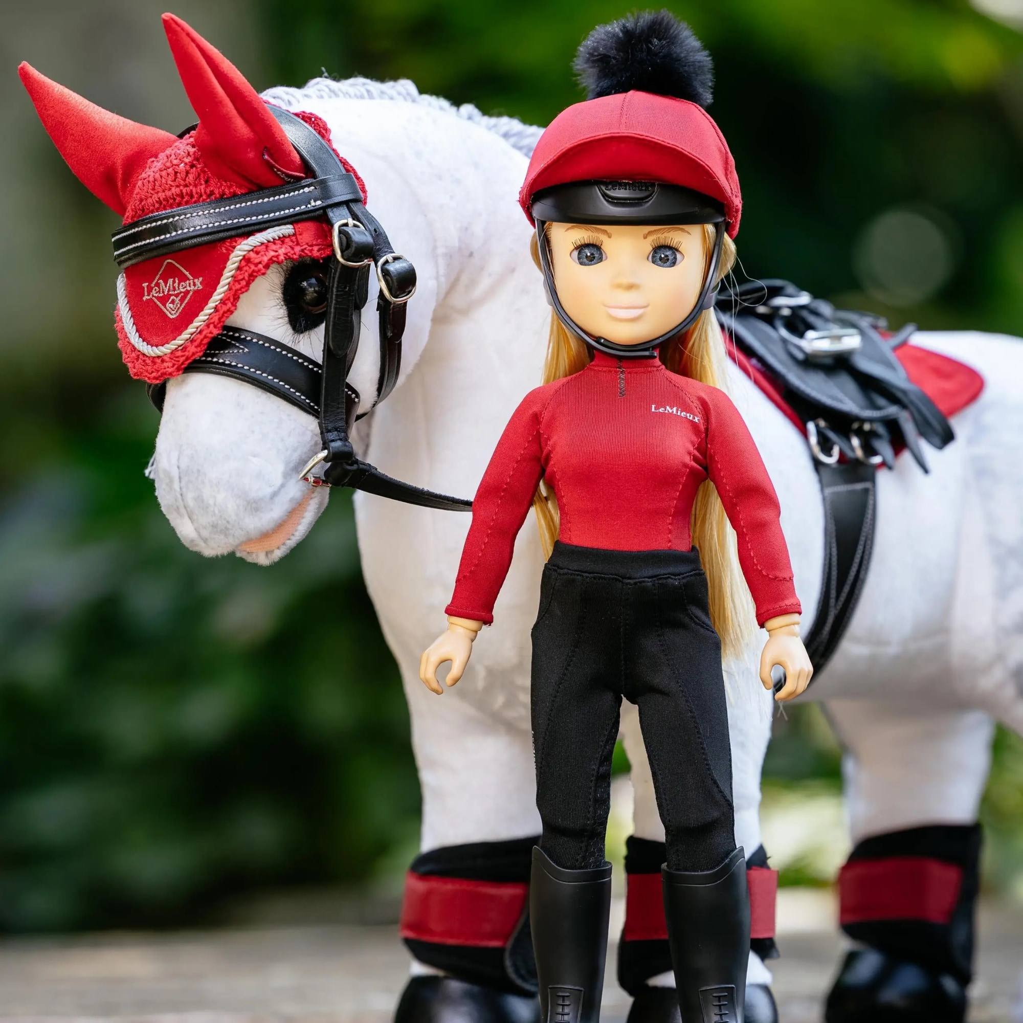 - Wears removable LeMieux outfit and riding accessories in Chilli Red