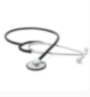 Flat stethoscope with simple metal chest piece. The chest piece is made of lightweight aluminum and has a diaphragm diameter of 44.5 mm. The hose is black and made of phthalative-free PVC.