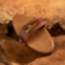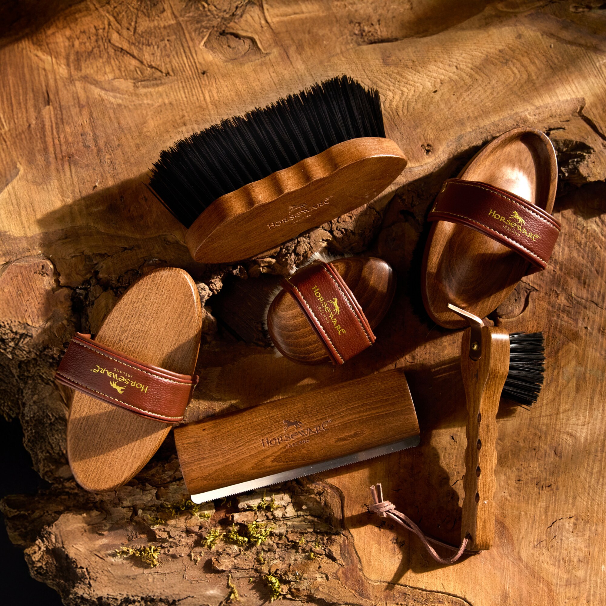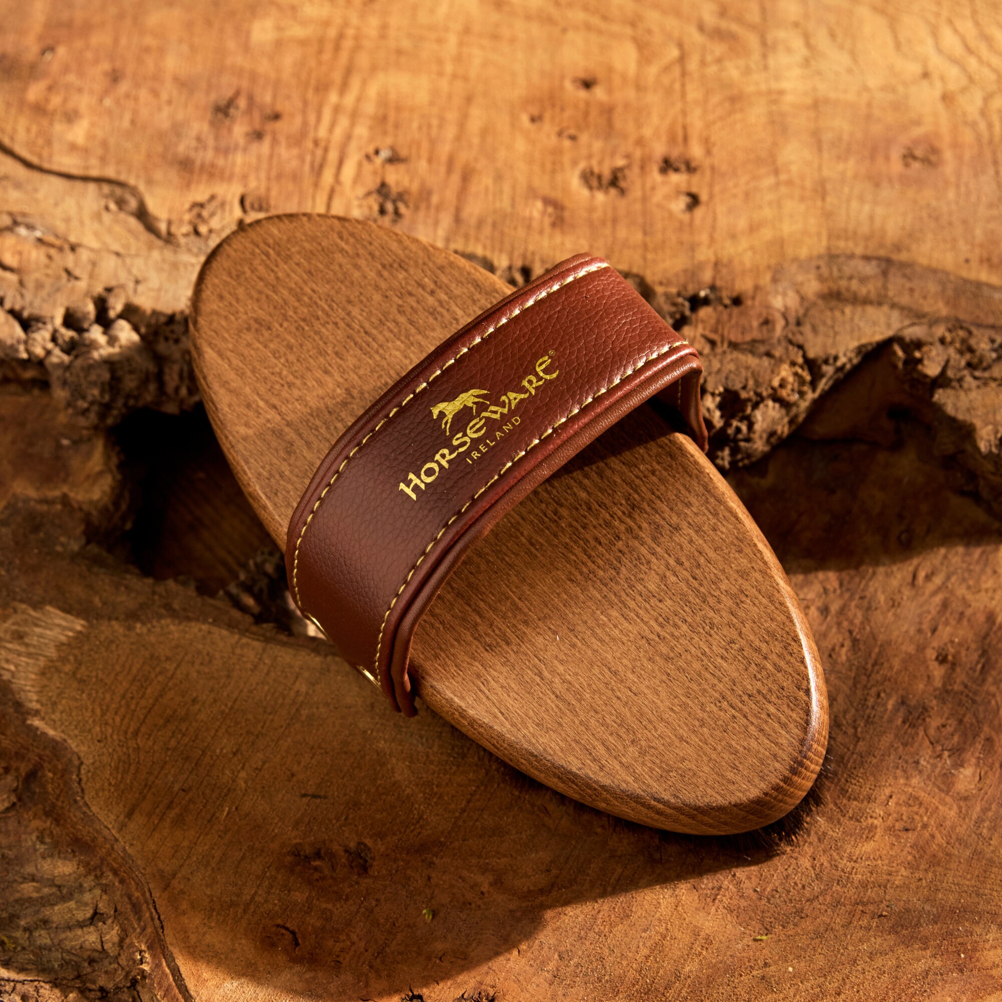 The brush features a balanced, handcrafted wooden base and a comfortable, water-resistant PU leather handle with elegant gold stitching and details, as well as an embossed Horseware logo for a sleek and premium look.