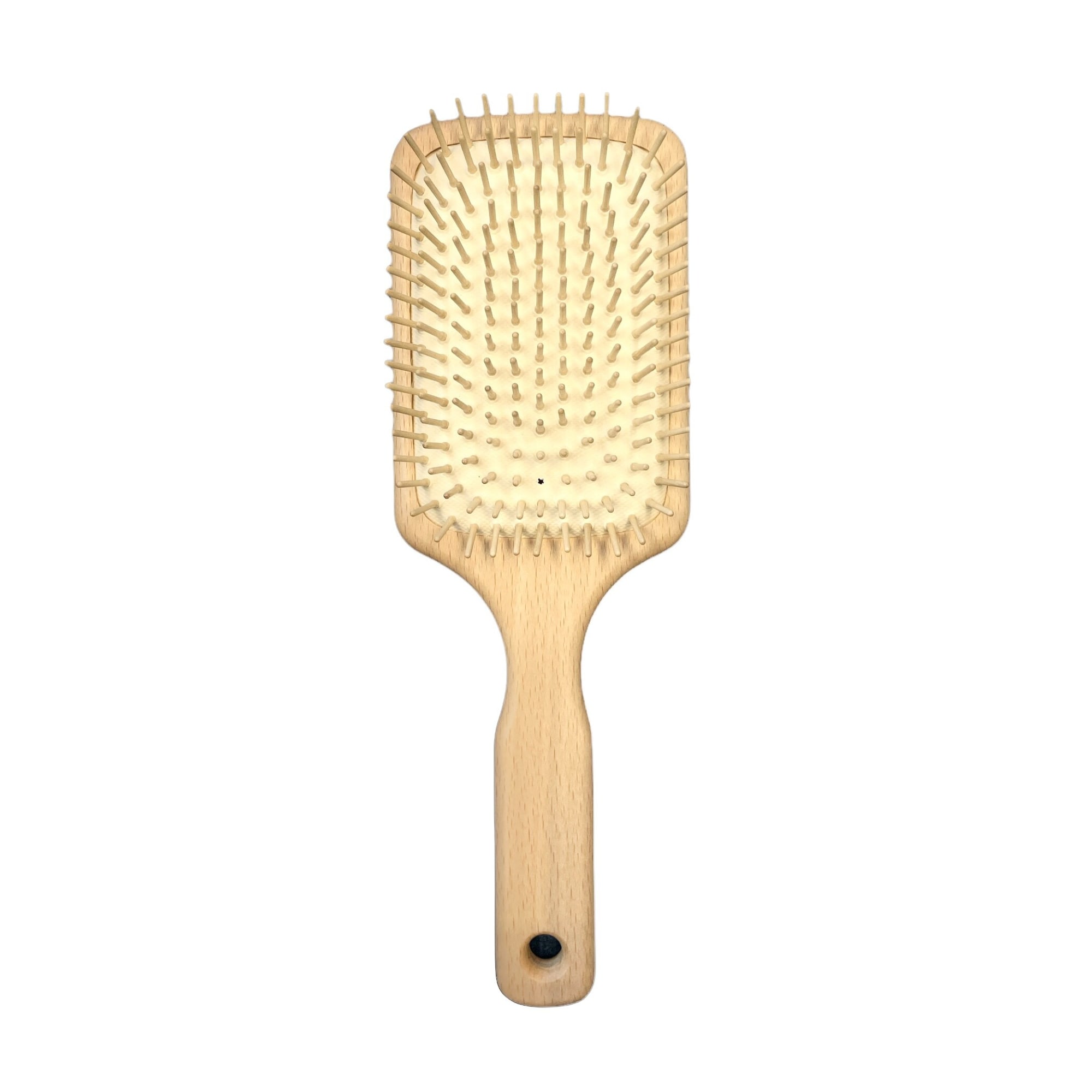 Wide mane and tail brush with wooden pins for gentle grooming of mane and tail.