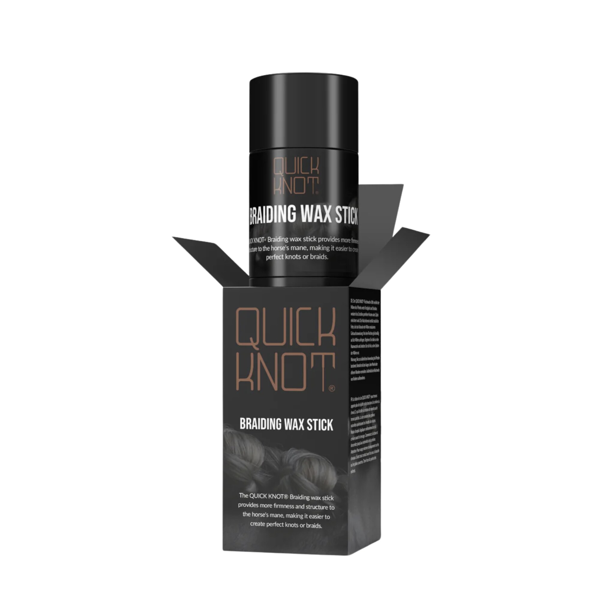 Quick Knot braiding wax from Hes-Tec makes it easier to braid mane and tail by providing better grip and keeping stray hairs in place. The wax is applied directly from the stick without mess and helps you create even, smooth braids and neat knots without loose hairs, with a natural shine.