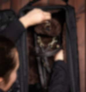 The bag's interior is lined with soft synthetic fur and equipped with an internal hanging bracket and clip to keep your bridle securely in place. Gold-colored air vents on both sides prevent moisture build-up, ensuring your bridle stays fresh. The thoughtfully designed bag also includes a zippered front pocket and multiple internal compartments, providing ample space for storing accessories.