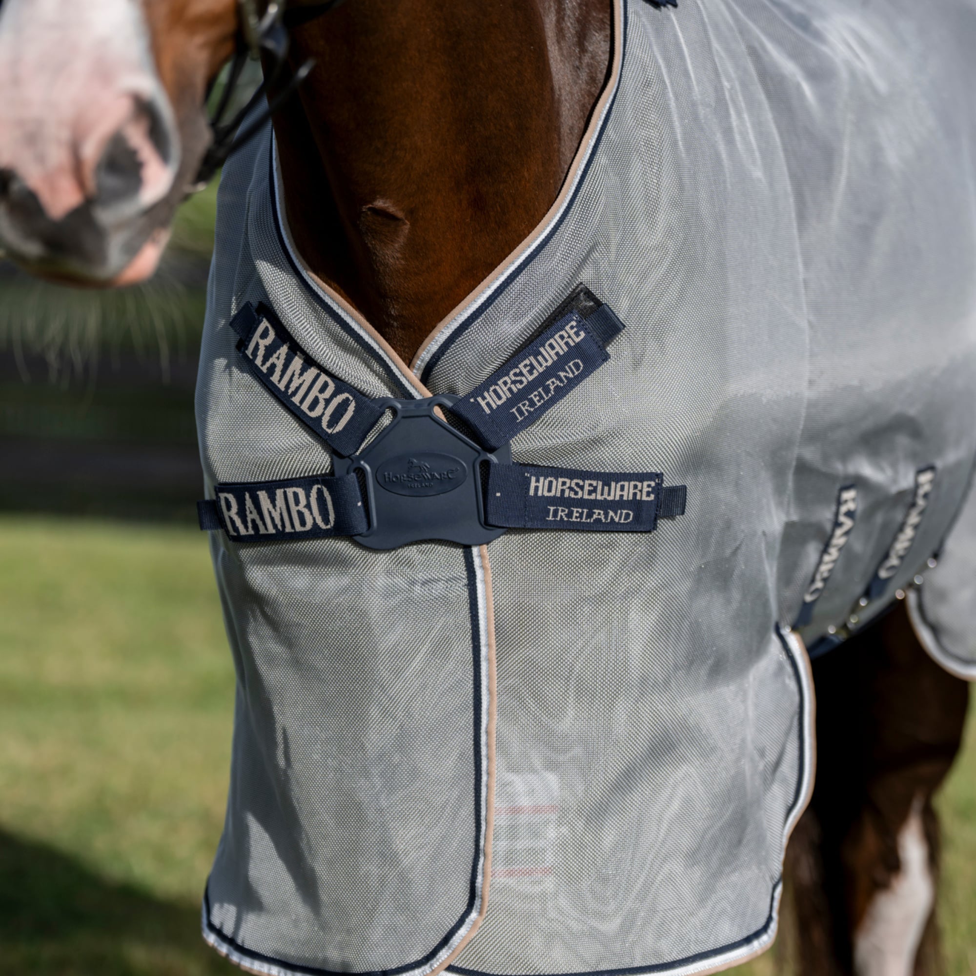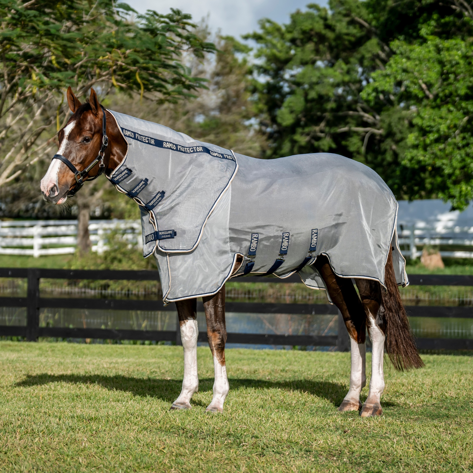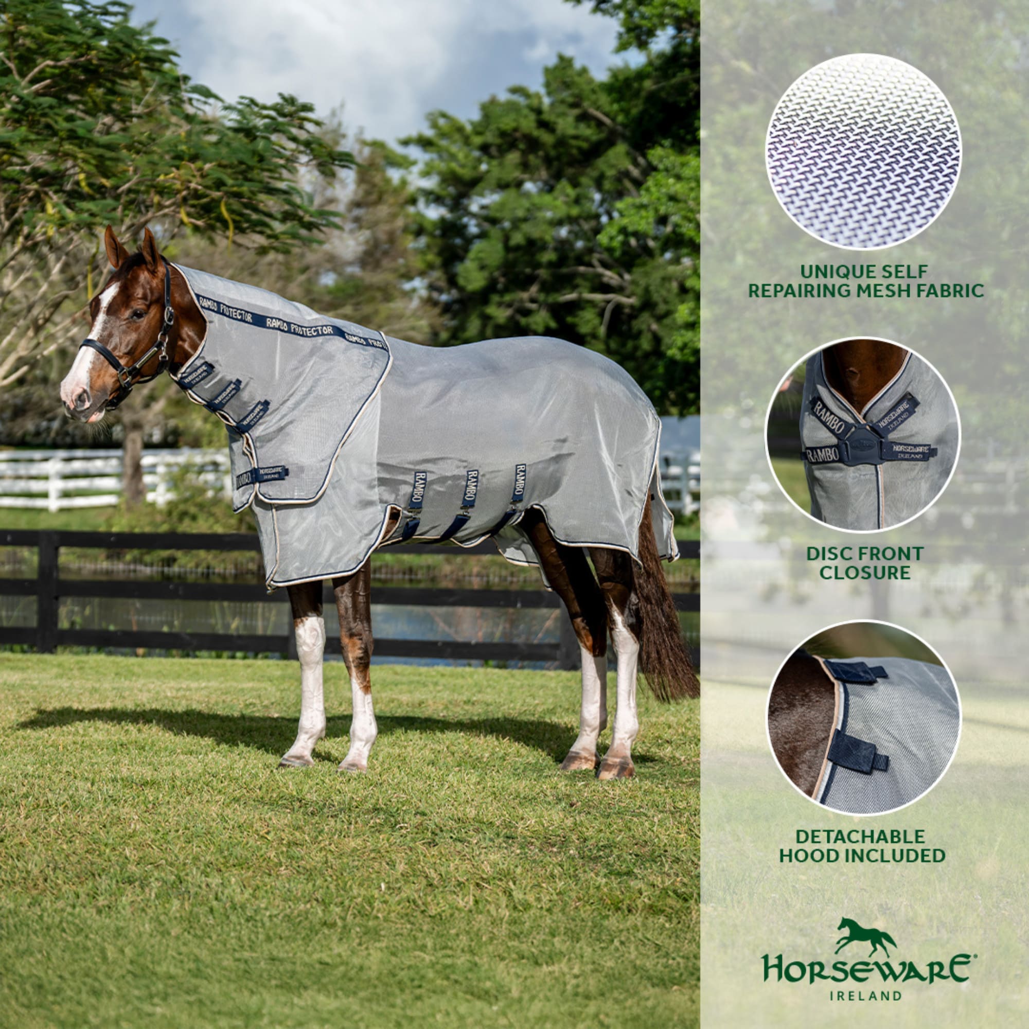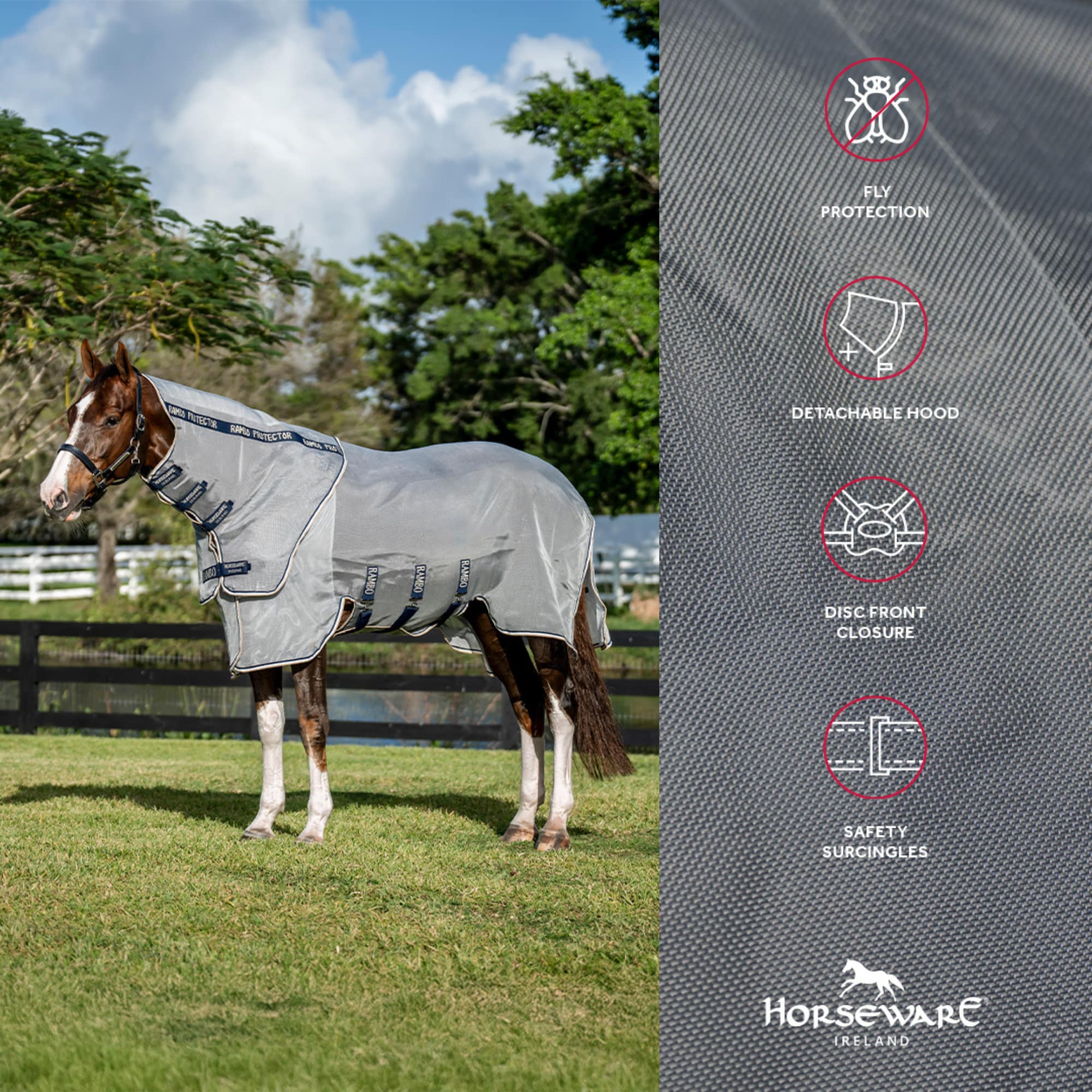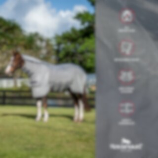 Rambo® Protector FieldSafe Plus Fly Sheet provides your horse with effective protection against insects and 65% UV Protection. Made from durable, self-repairing mesh fabric with a detachable fly hood and ergonomic Disc Front closure.
