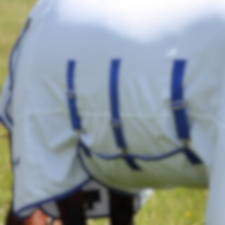 The rug has an integrated neck, belly flap and a large tail flap that provide generous coverage over the whole body. The durable outer fabric helps protect against sunburn and bleaching, while mesh panels allow airflow for good ventilation. The rug fastens at the chest with buckles, has an adjustable fillet strap, and the lining over the shoulders helps reduce the risk of rubbing.