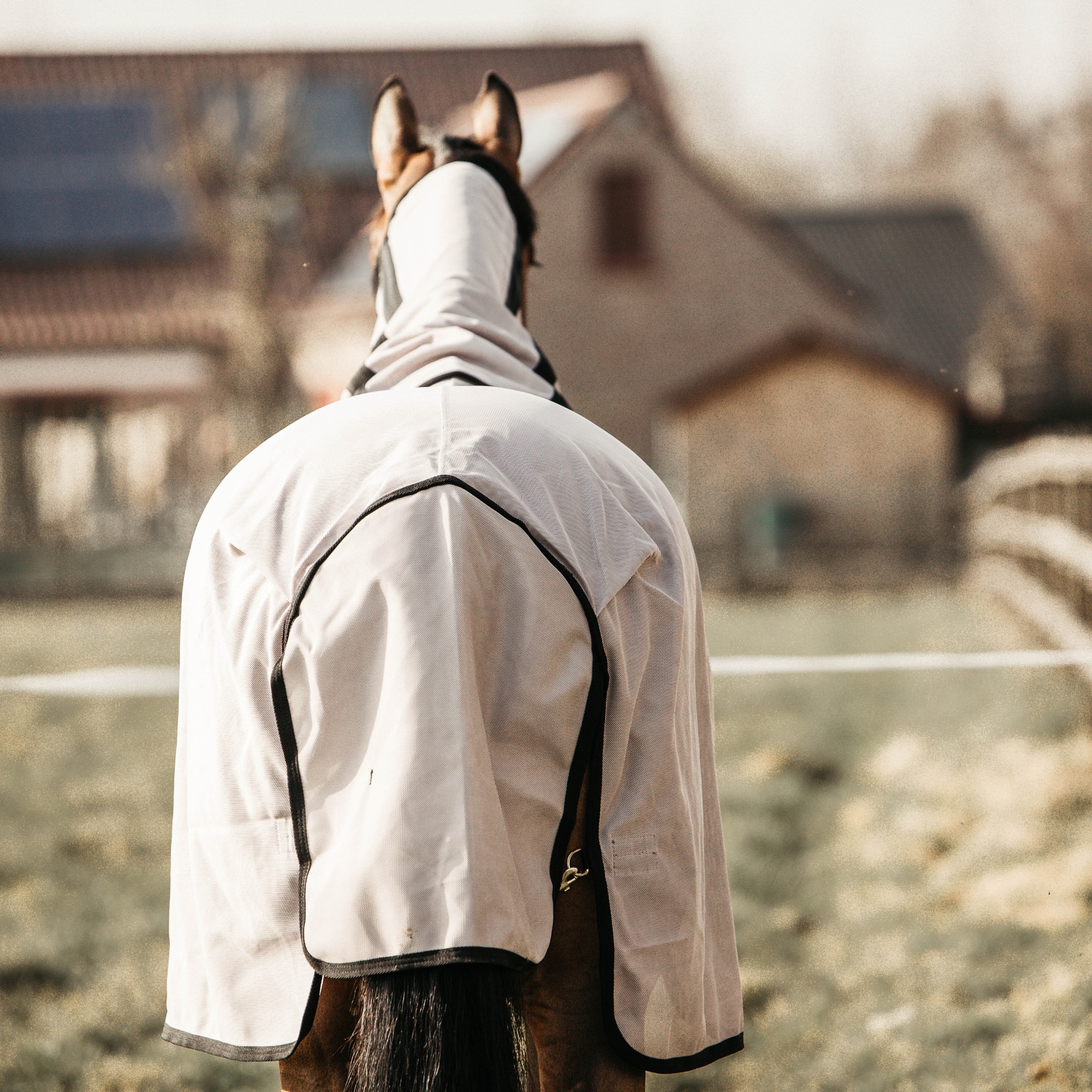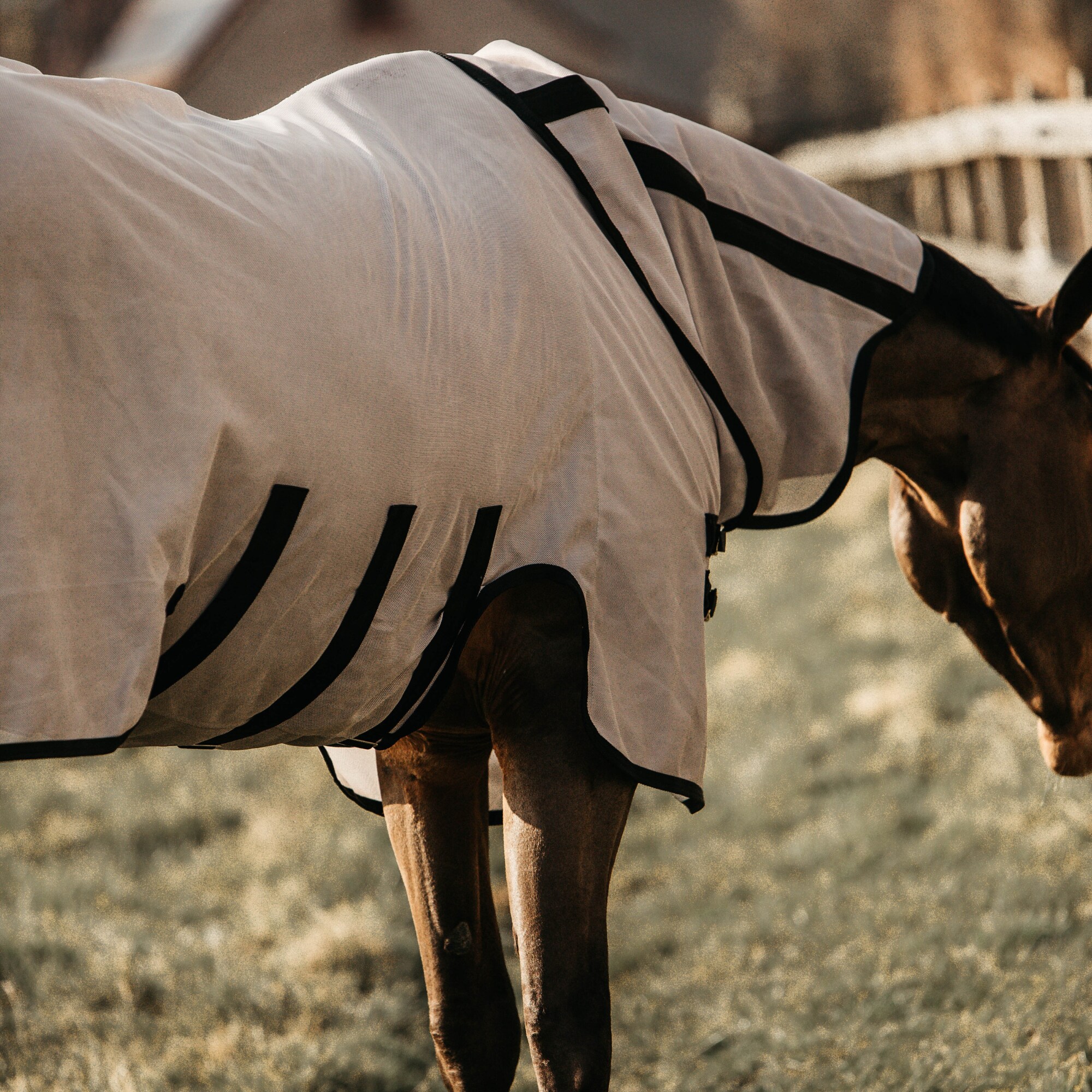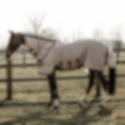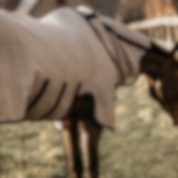 The material of the mesh blanket is strong, but you still have good breathability so that your horse can still enjoy a breeze of fresh air. The inside of the shoulder, neck and tail have a smooth inner lining to prevent chafing. The rug is anatomically shaped for the best fit and to prevent the rug from moving during the day. The buttoning in the shoulder is triangular in shape to reduce pressure on the withers and shoulder. The neck part of the rug is removable and has a reinforcement in the sides that keeps it up in a good way. The tail piece is extra large and has an elastic band that you can thread the tail through so that it stays in place, the belly plate is closed with three straps and also protects the horse's stomach from the insects.