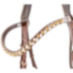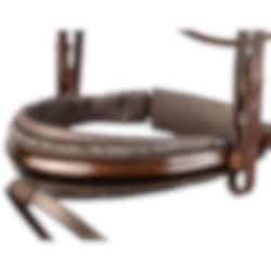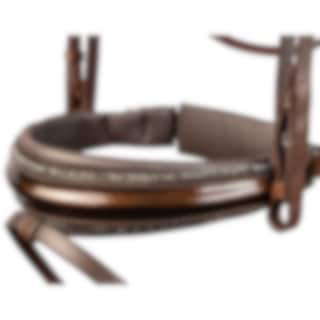 The Tokyo bridle is crafted in the color Chocolate with a flattering, patent noseband in Bronze Loom Patent and fine line piping in the color Met.Gold. The padding is in the color Negro. The beautiful curved browband is adorned with genuine Swarovski Rivoli XL stones, 12 mm in size, in the color Golden Shadow.