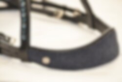 This is a black bridle with a top quality leather with exclusive details in the form of dark blue glitter on the noseband and neckpiece. The neck piece is ergonomic and really soft with an upper side decorated with Crysal Fabric in Montana blue. The noseband is a Comfort XS 5 cm, which means that the noseband is widest at the front and tapers towards the sides where the horse has the least space at the bit, the closure of the noseband is buttoned back. The noseband is also decorated with a wide piping with Crystal Fabric in the same Montana Blue color as the neck piece.